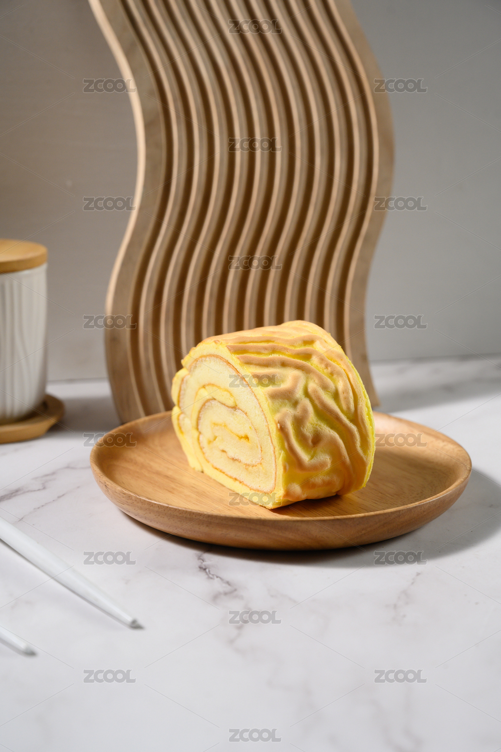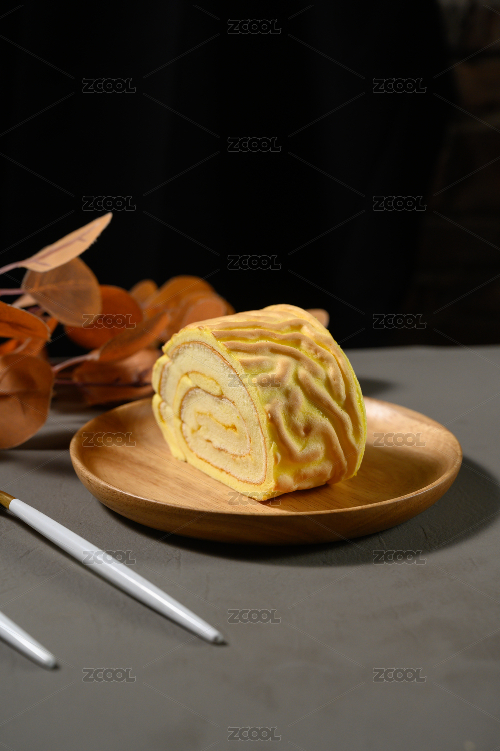 桌面上的盘子里的美味可口的虎皮蛋糕卷