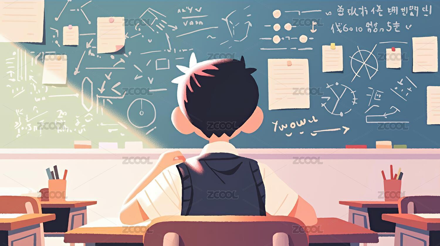 手绘插画 两位学生坐在书桌在写满公式的给办前举手加油