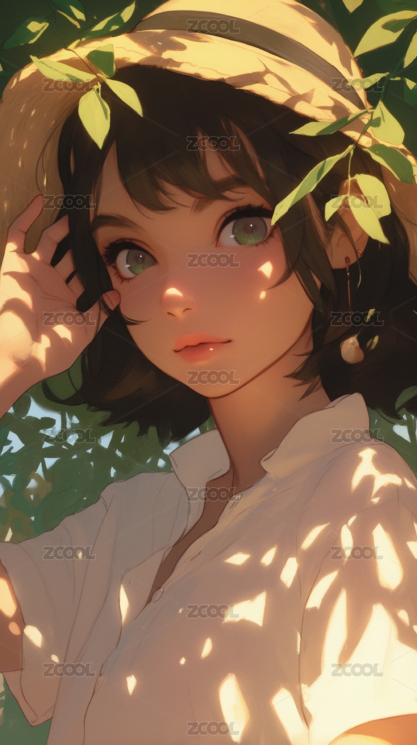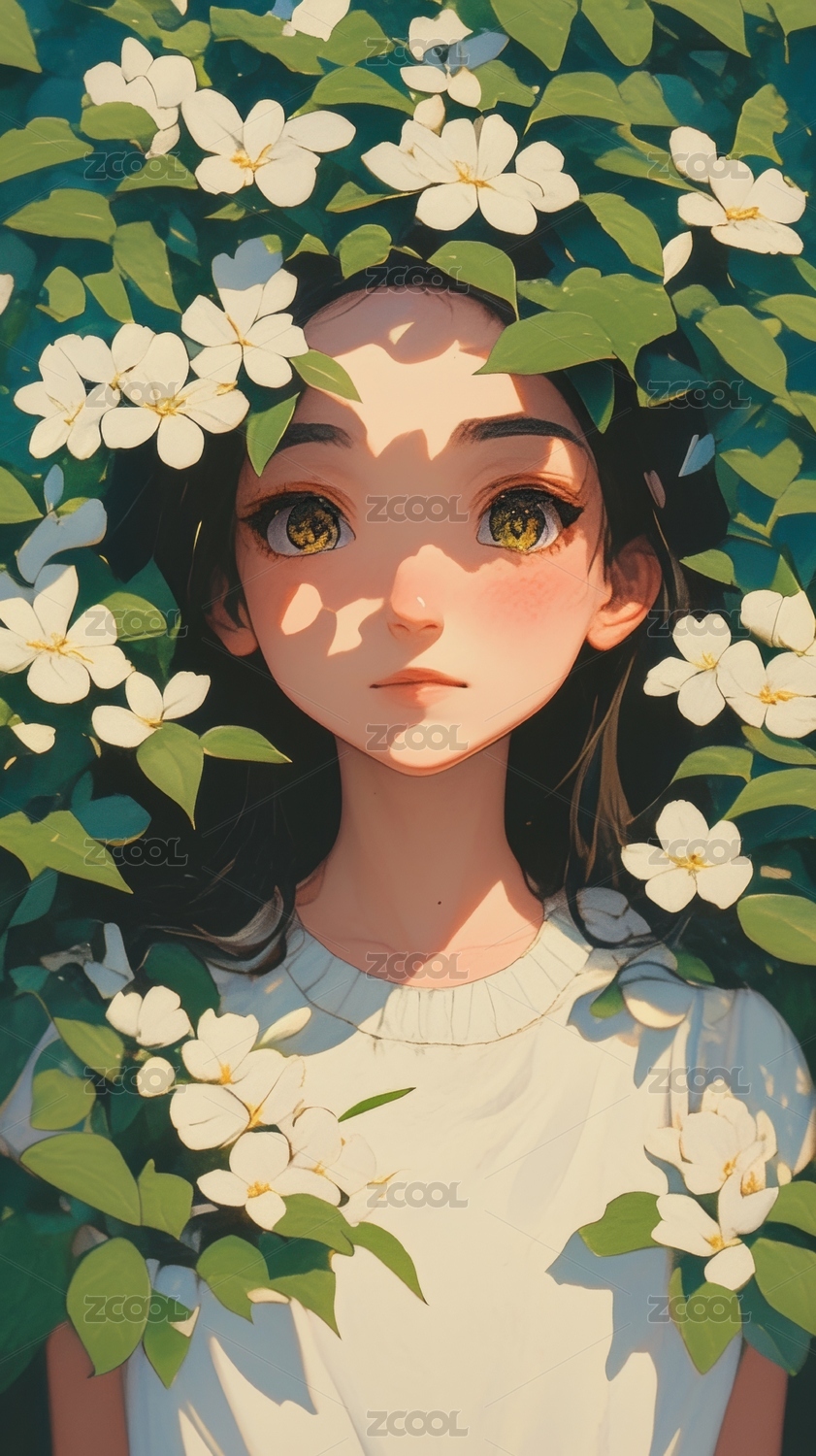 二次元动漫少女人物被绿叶围绕