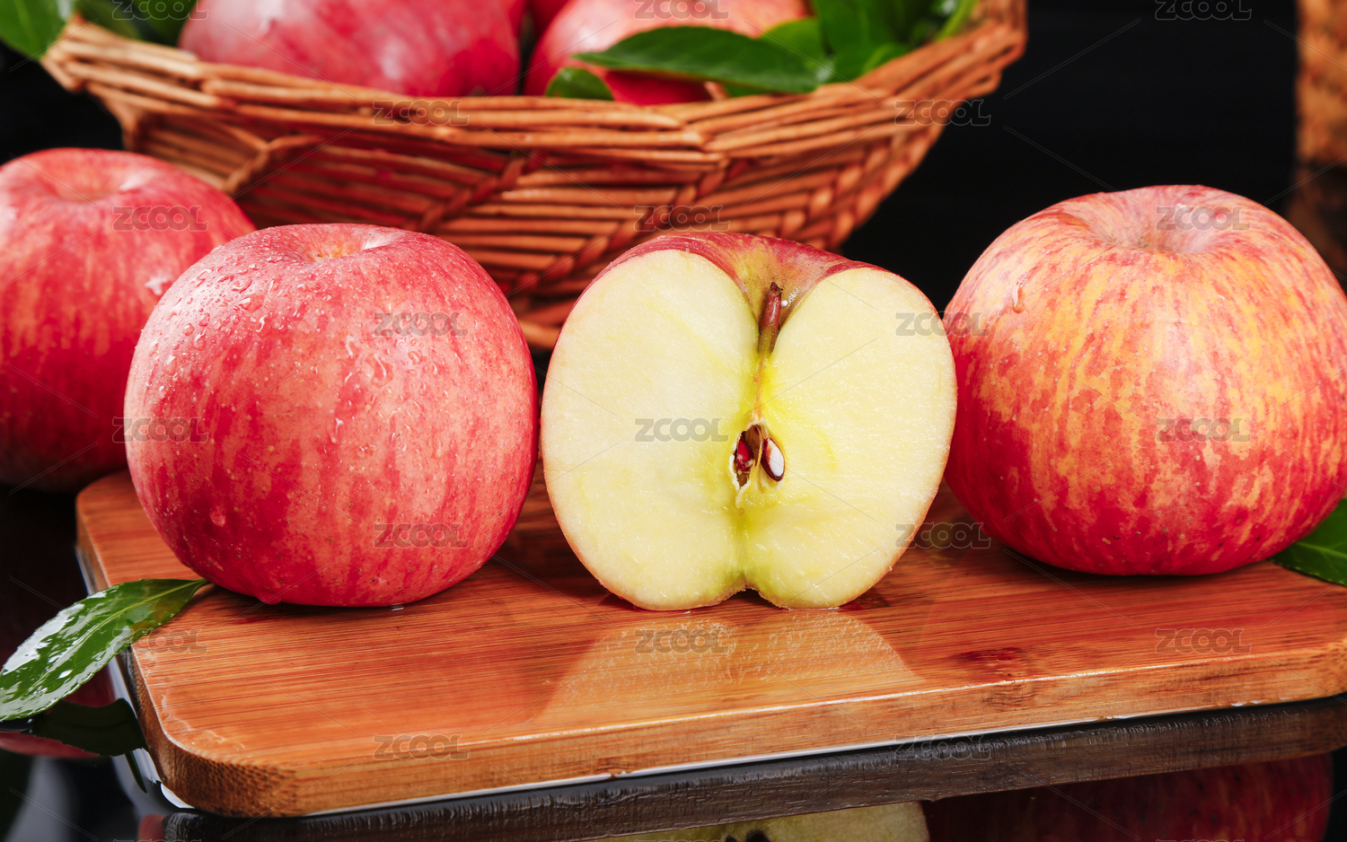 黑底上放着一篮烟台红富士和红富士果肉