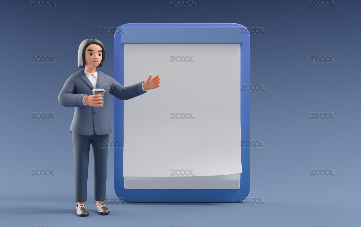 穿蓝色西装拿杯子的3D商务女性站在报表前