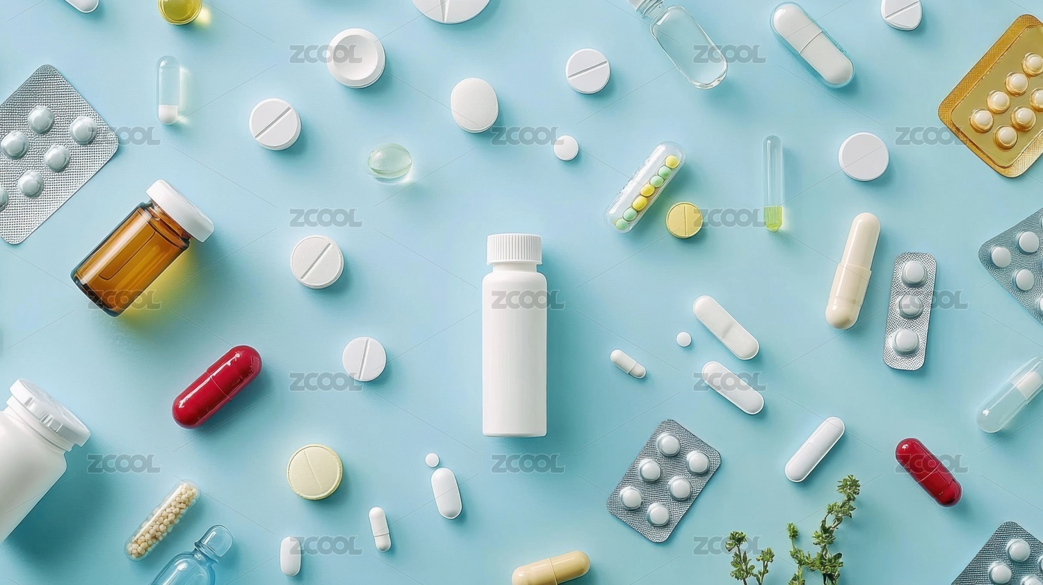 胶囊药片药品药瓶漂浮展示,三维简约背景