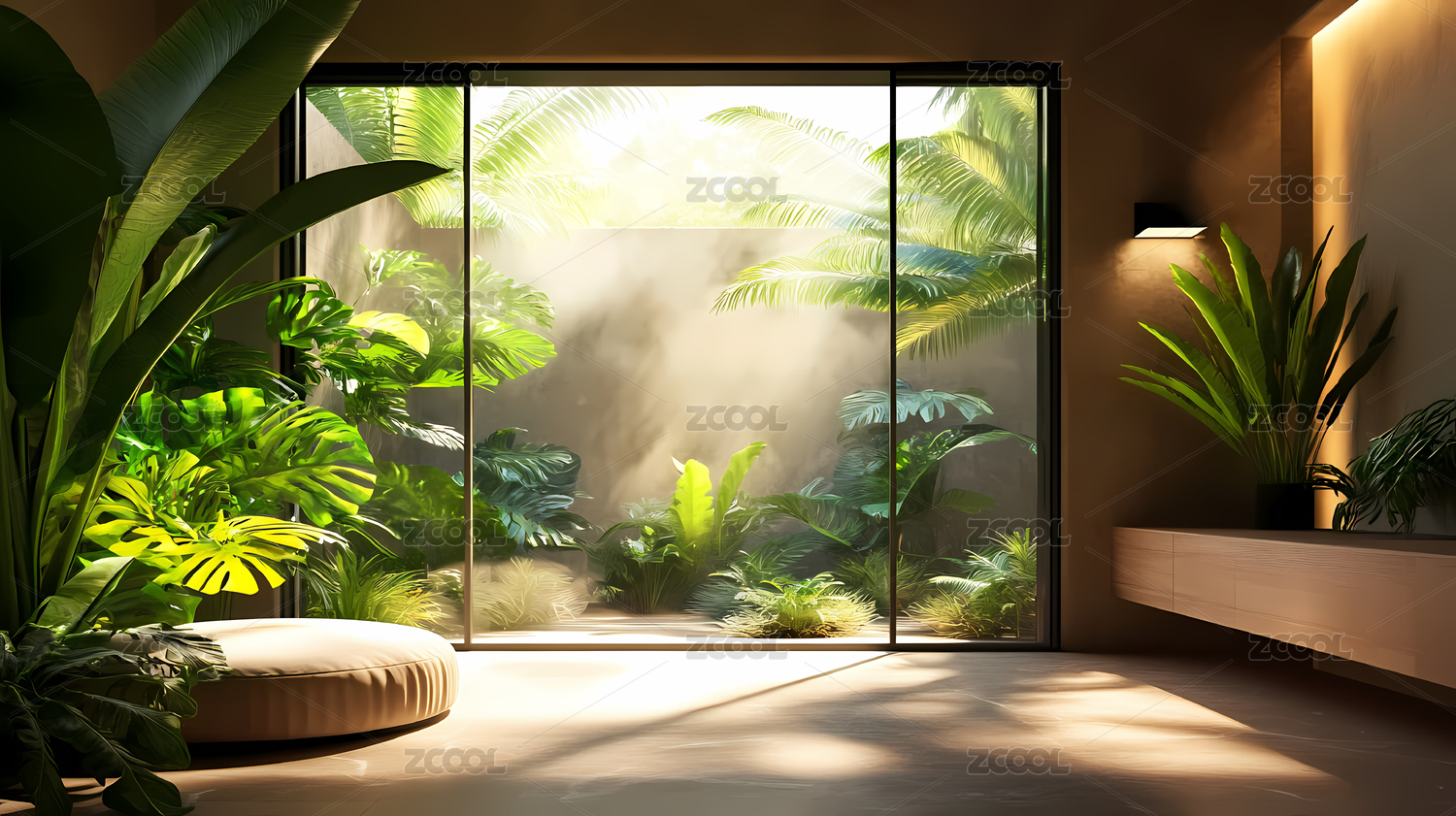 阳光洒满室内热带植物