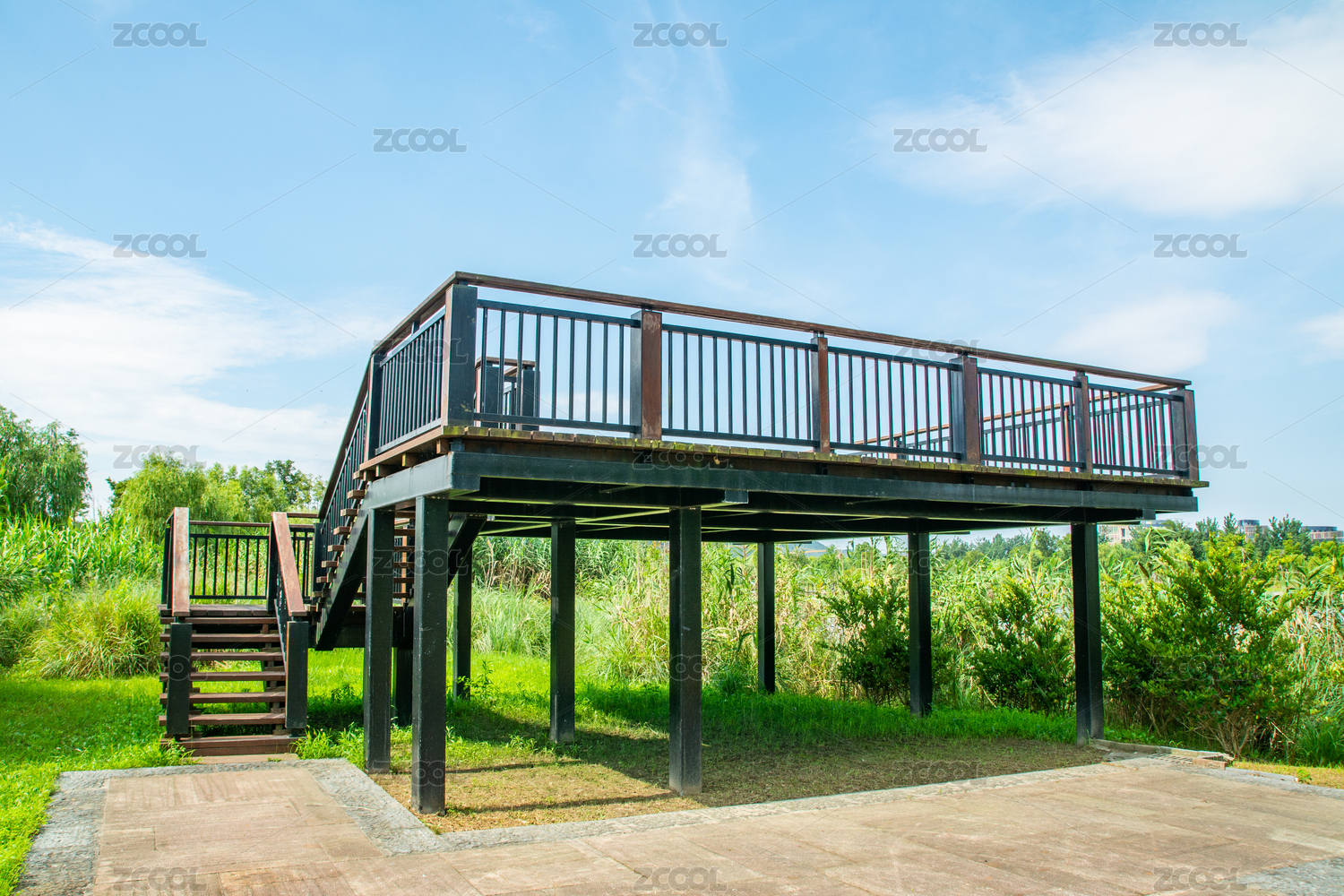 生态公园中粉黛乱子草环绕的观景台