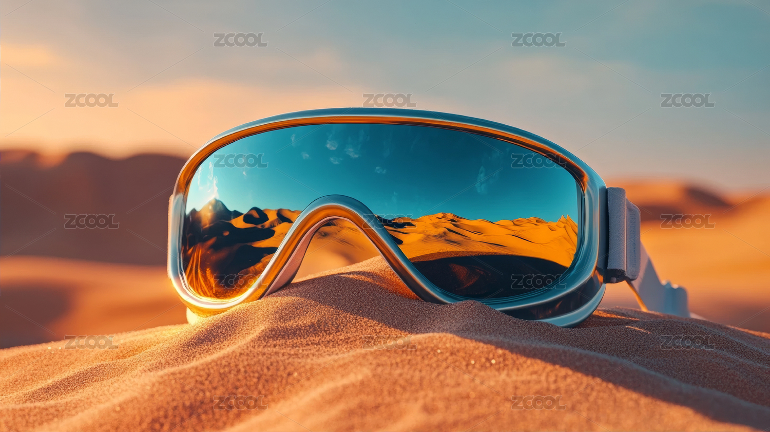 橙色沙漠中滑雪眼镜反射蓝天展现冒险精神