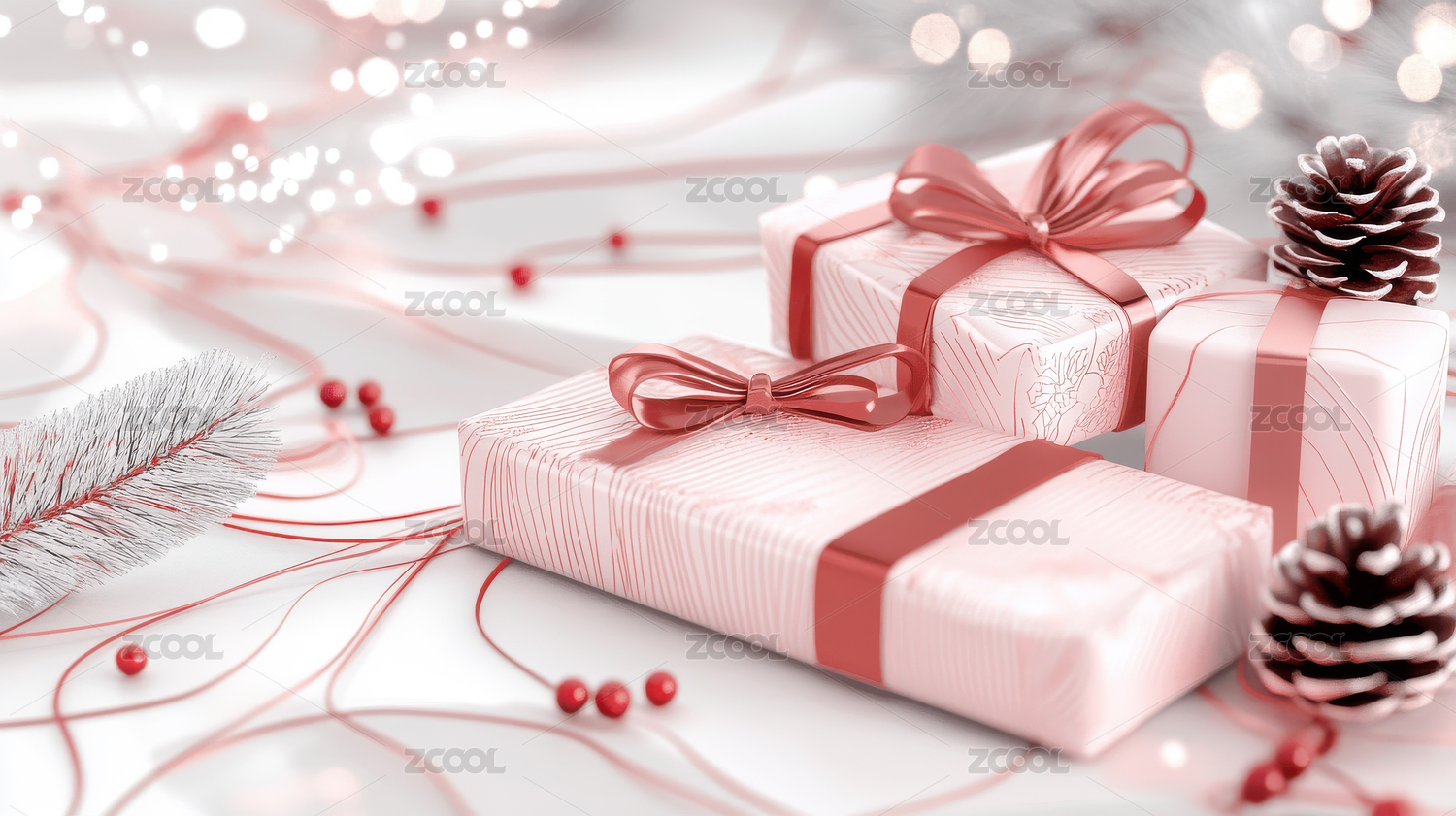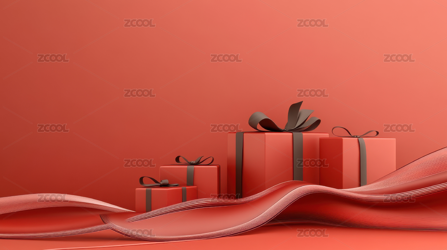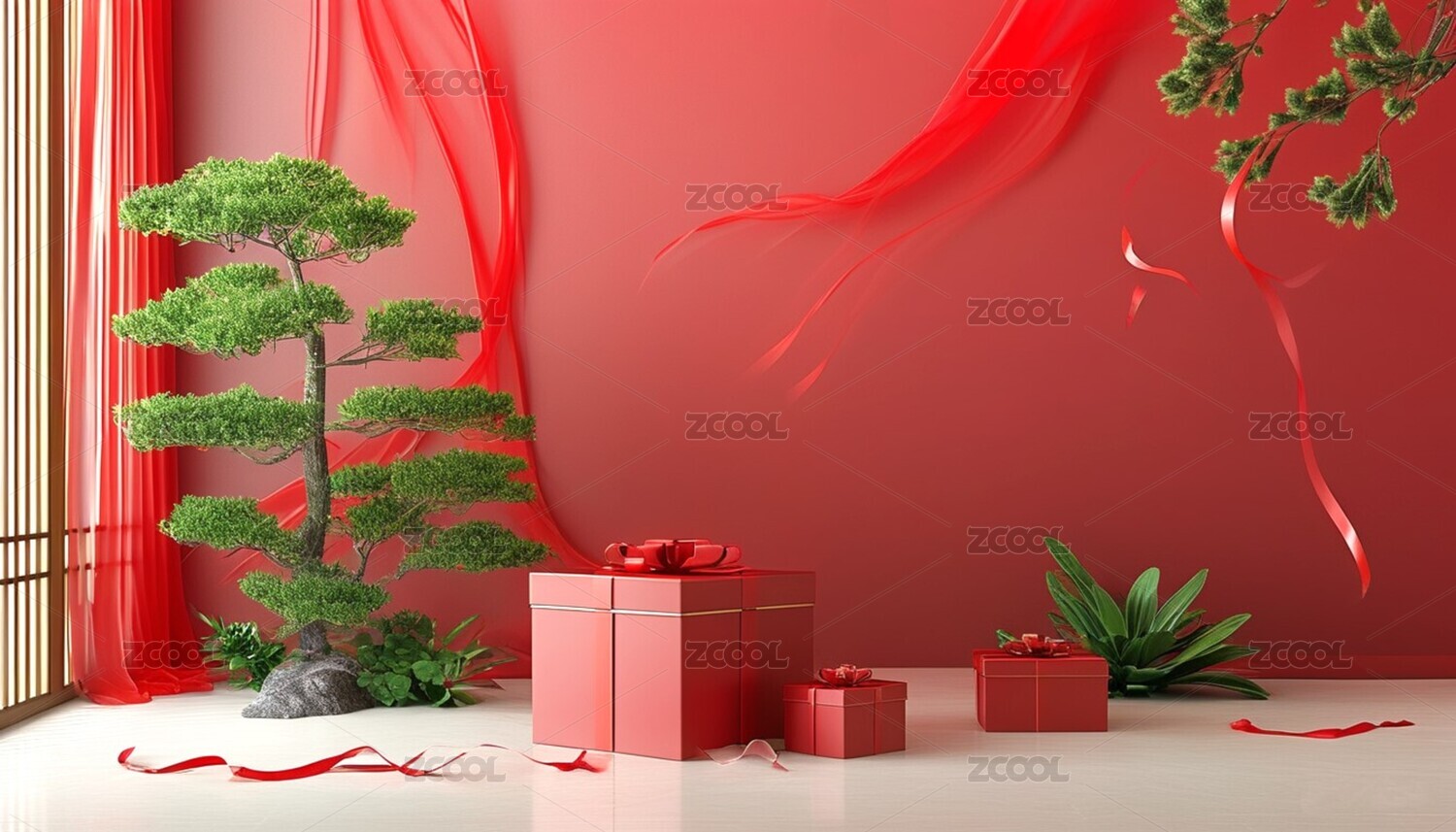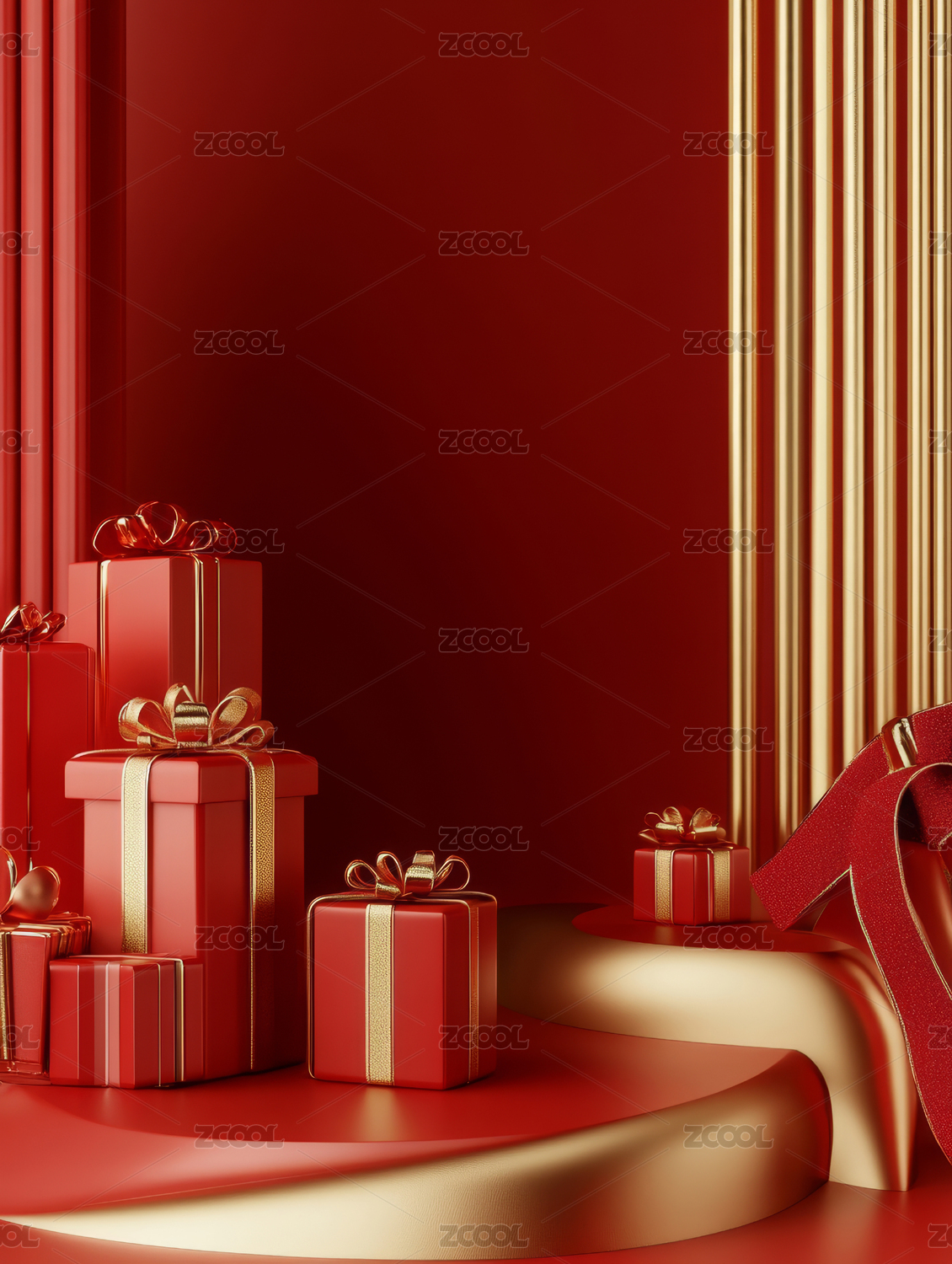 电商展台室内立体展示背景节庆礼物盒红飘带
