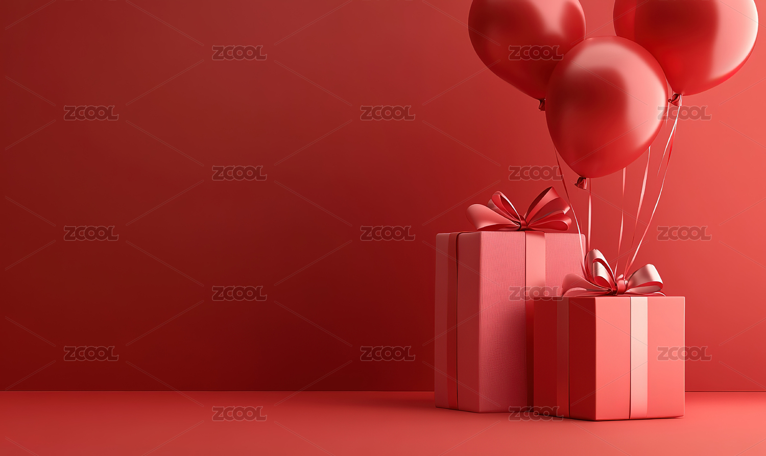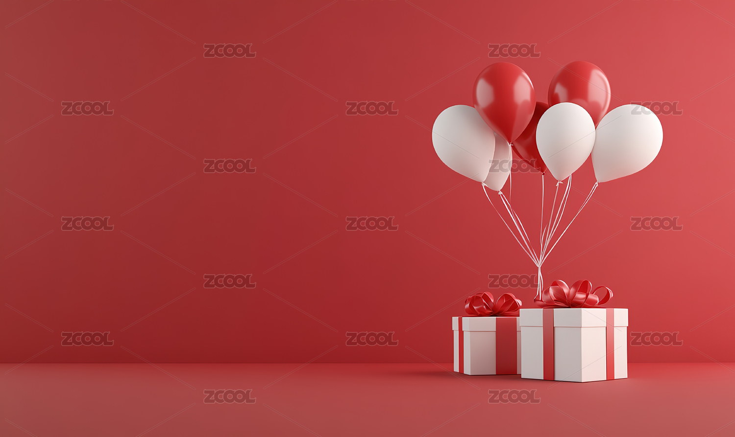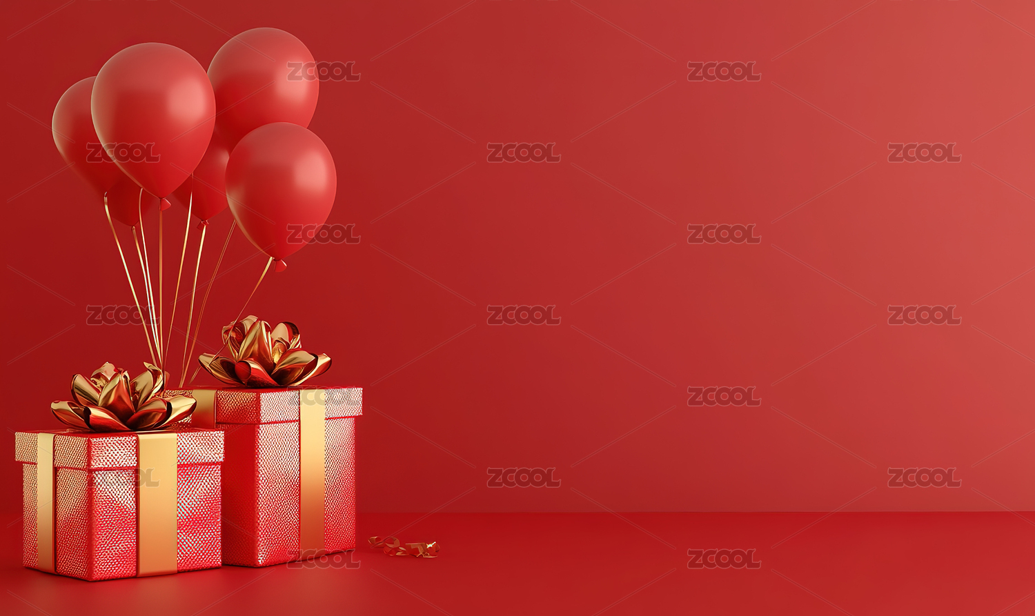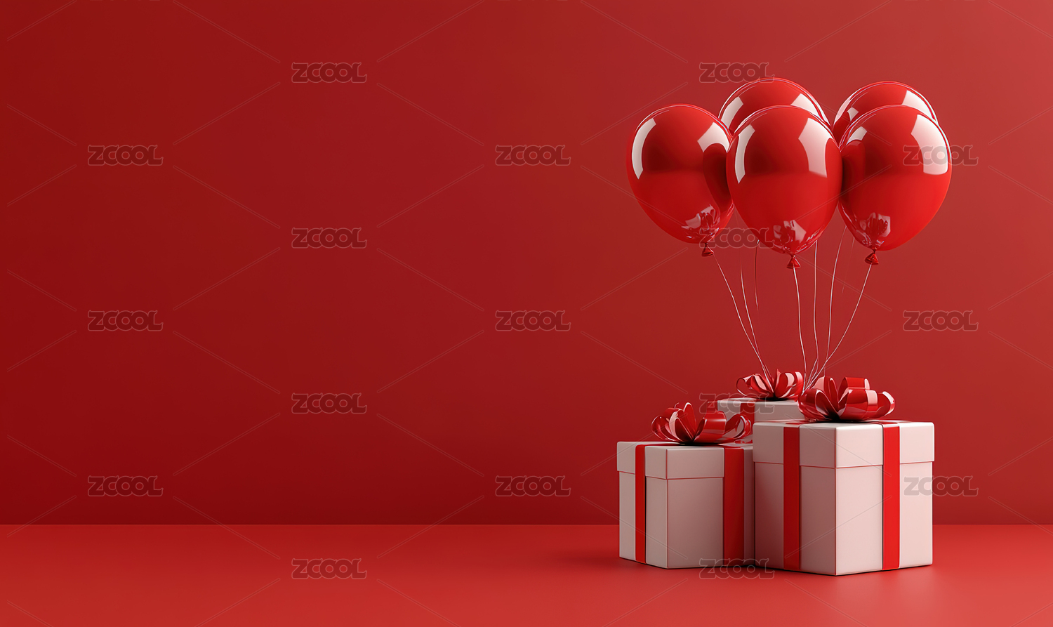 红色背景下的节日礼物和气球