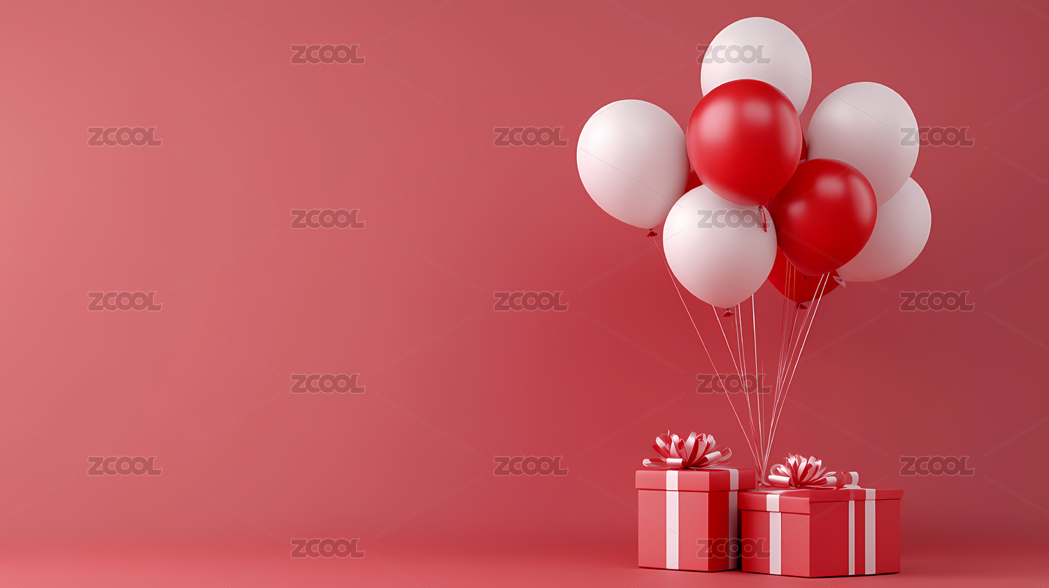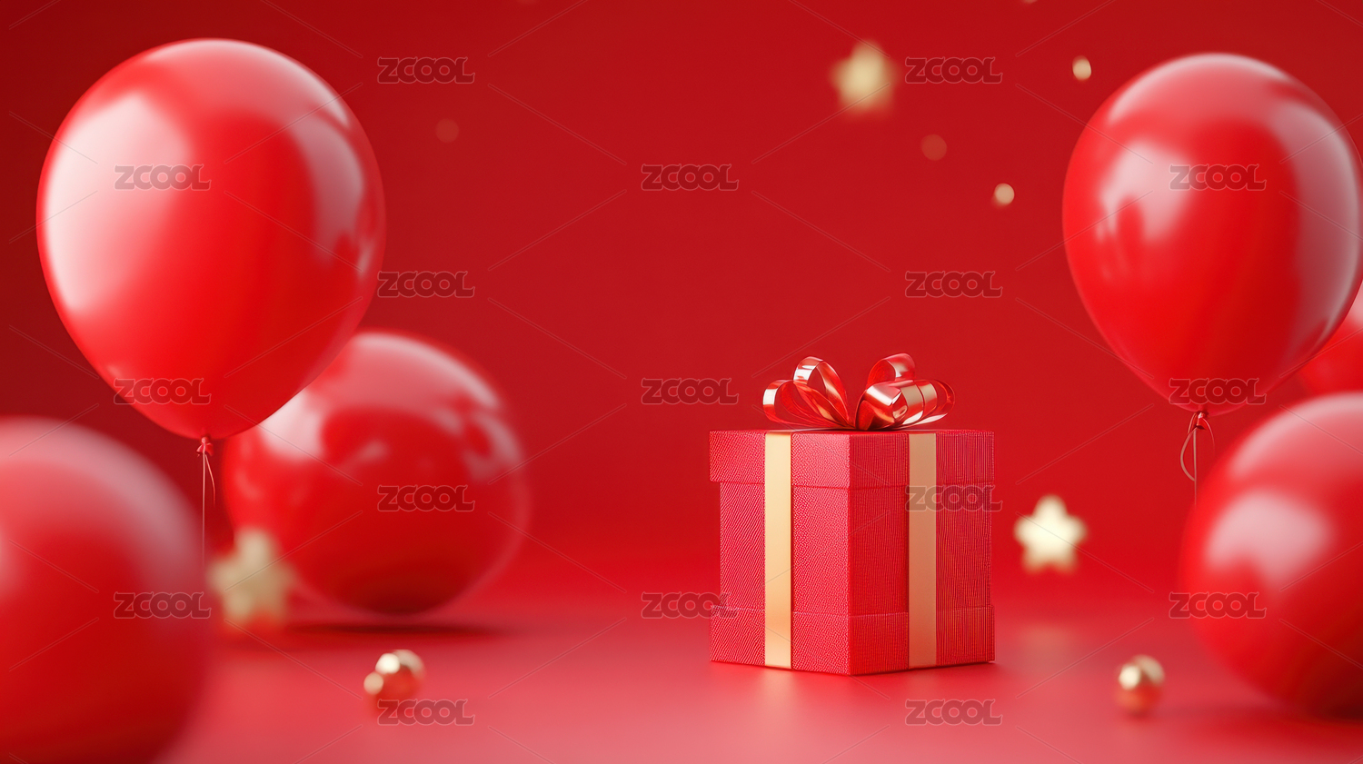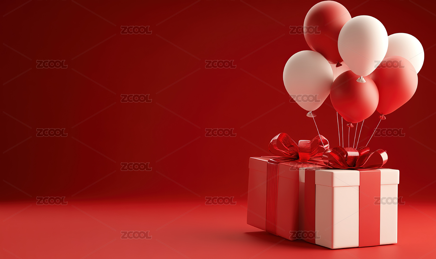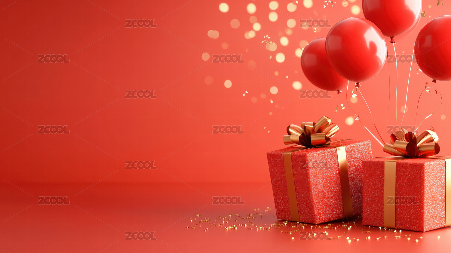 红色背景下的节日礼物和气球