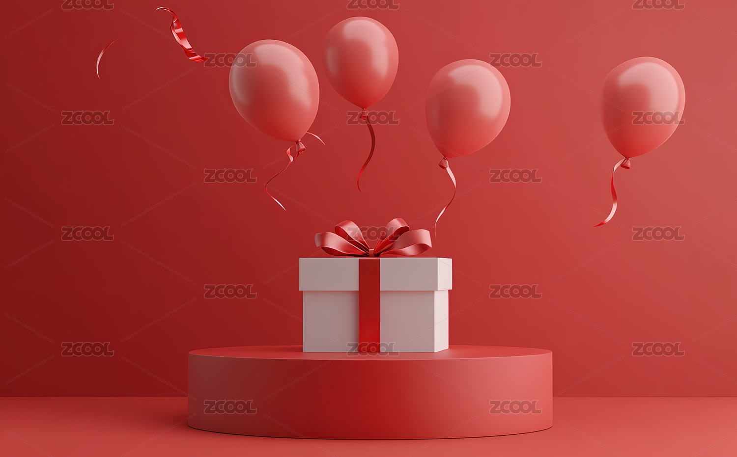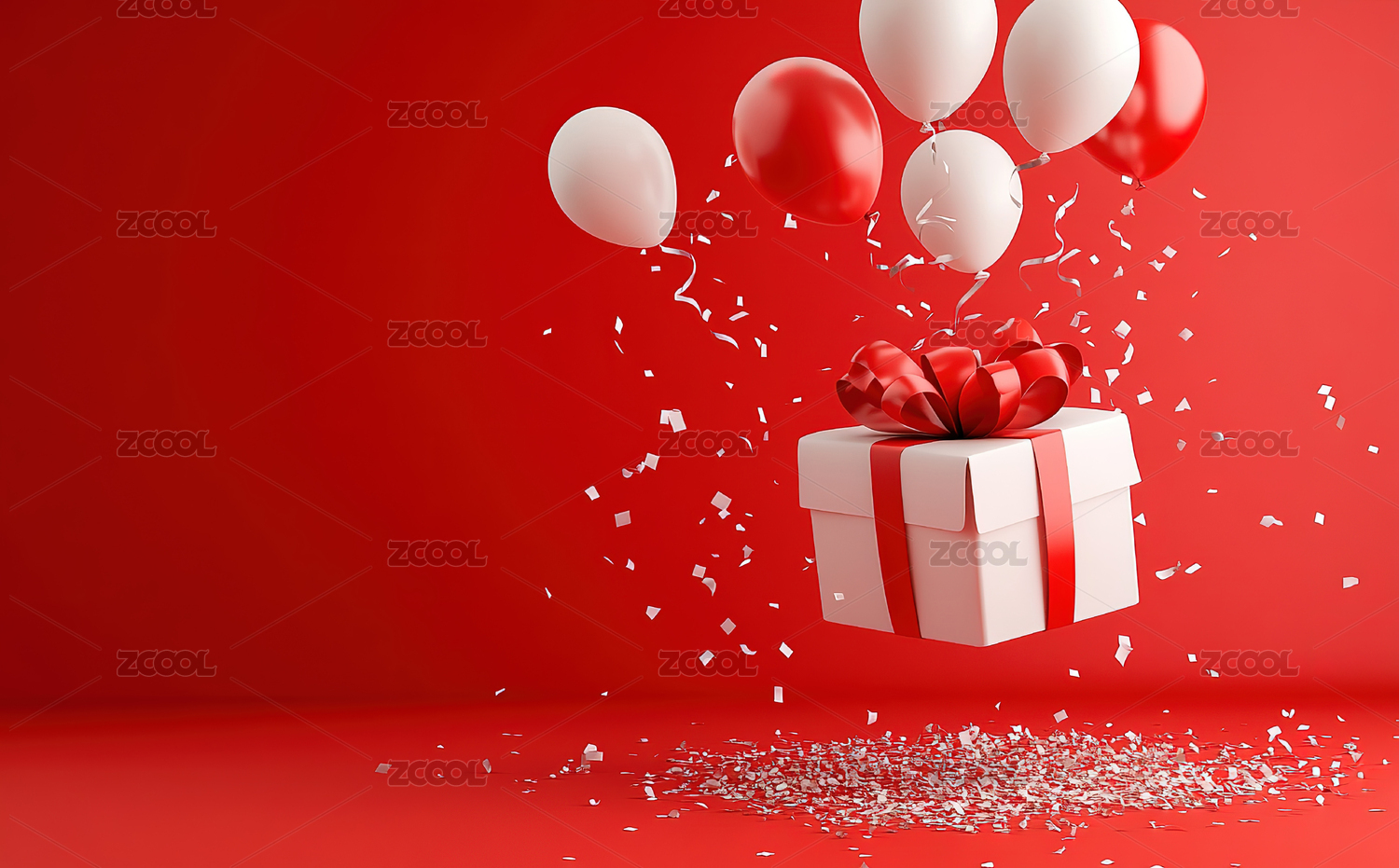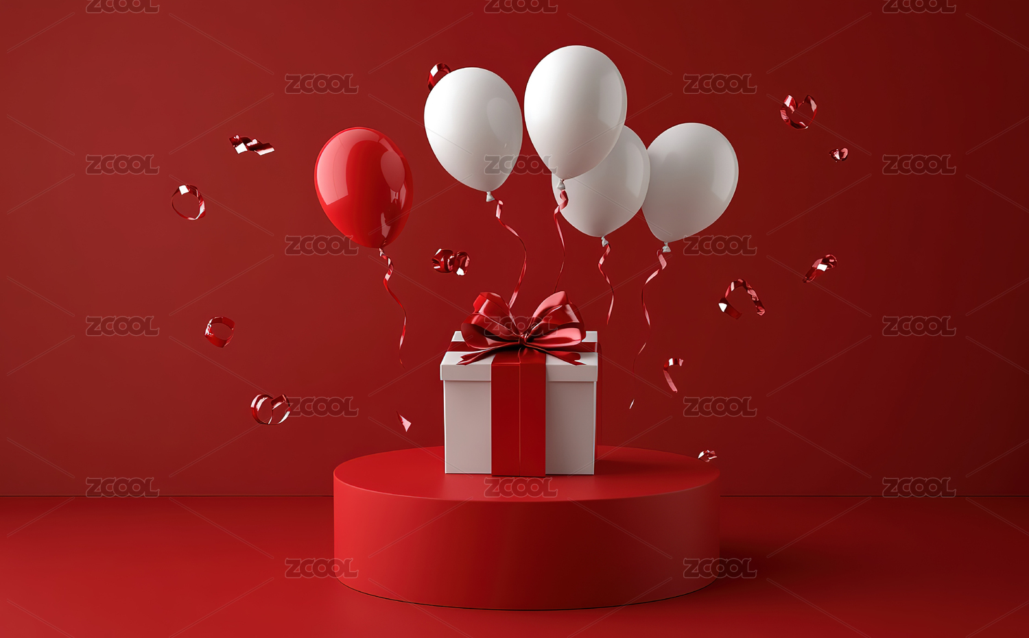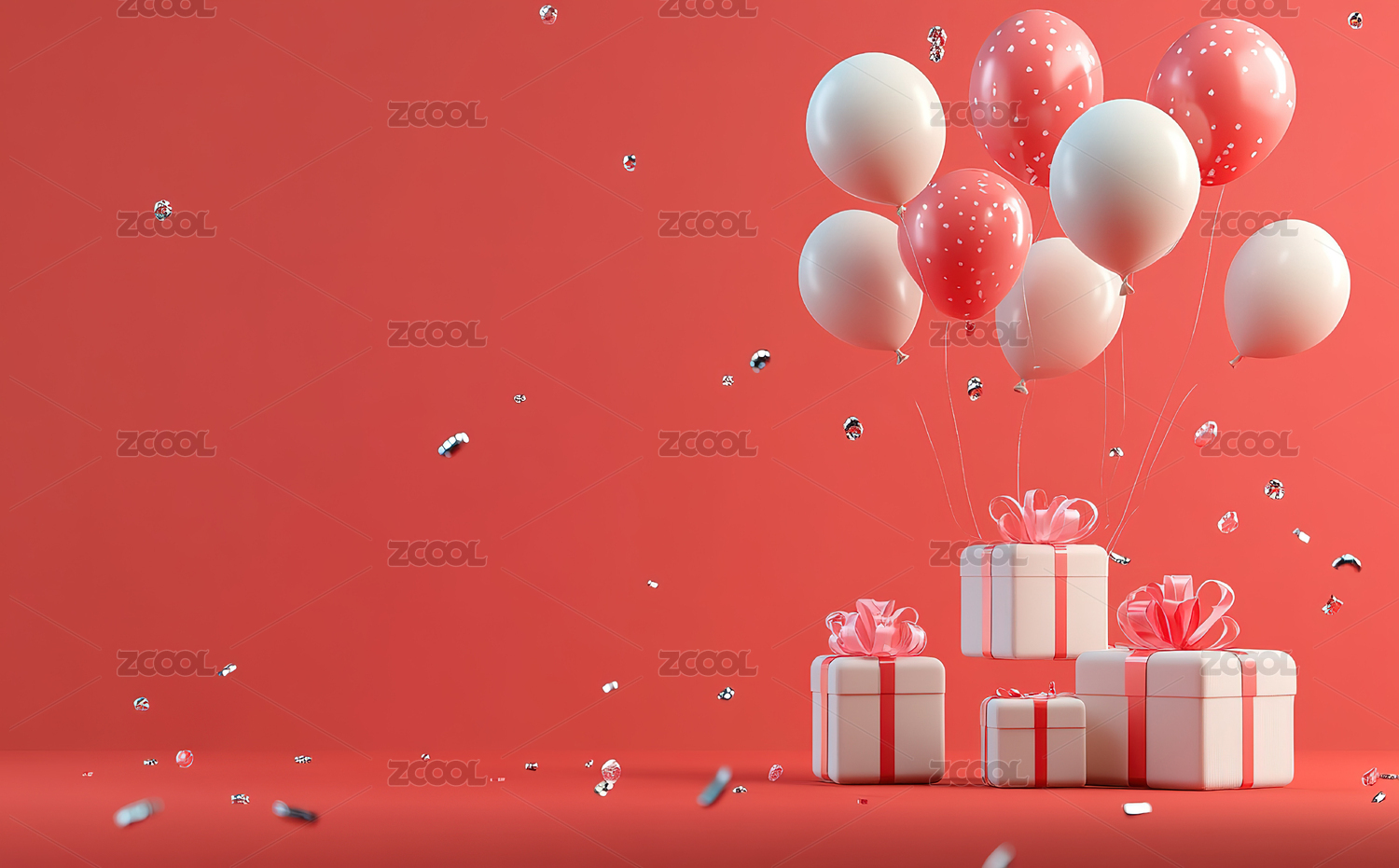 红色背景下的节日礼物和气球