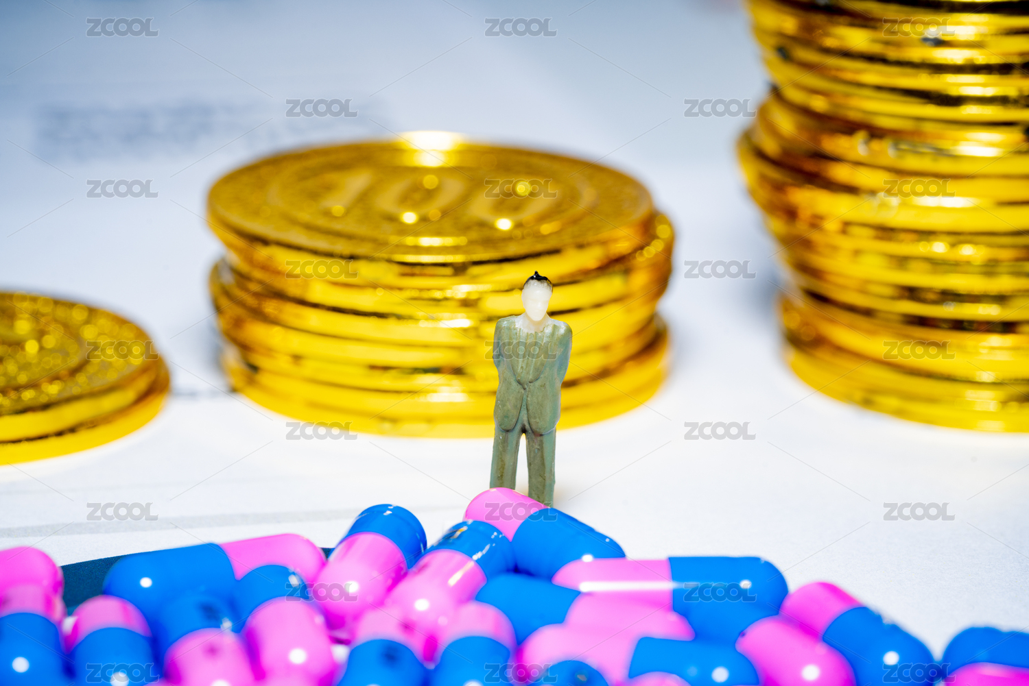 金币下站着沙盘微距摄影小人国表达药丸胶囊赔本输钱亏损压力失败概念