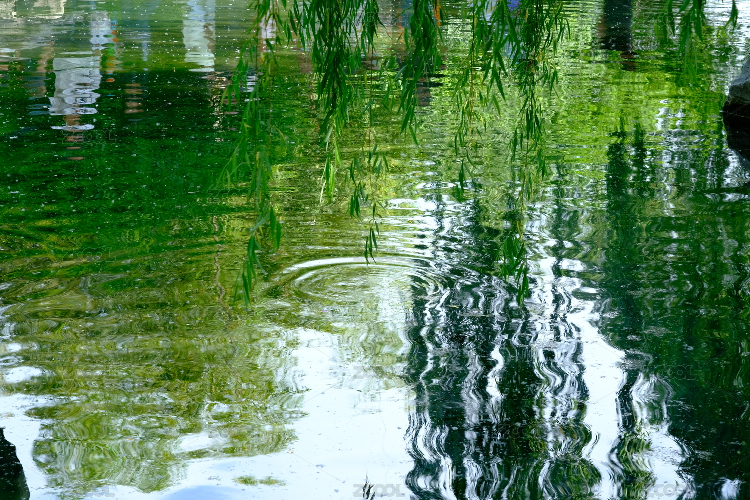 雨滴溅落在倒影着树木的碧绿的潭水里