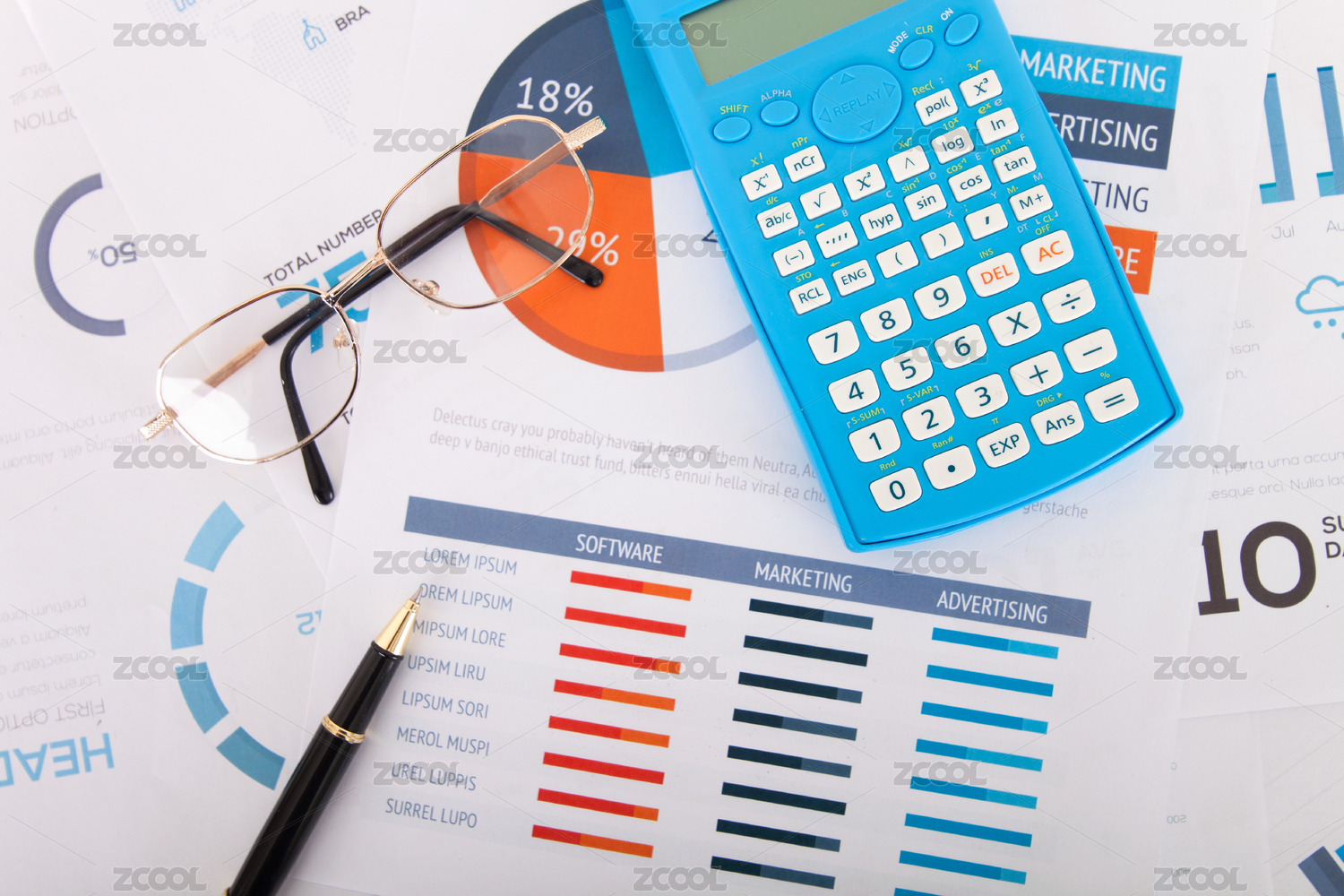 金融文件上的计算器和签字笔及一副眼镜