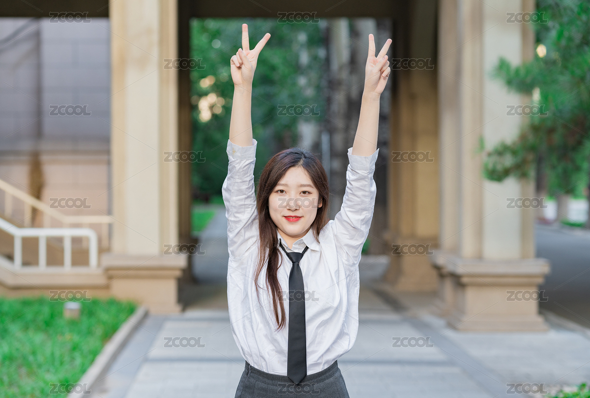 美女大学生伸着手举起剪刀手手势表示胜利放松轻松加油鼓气概念