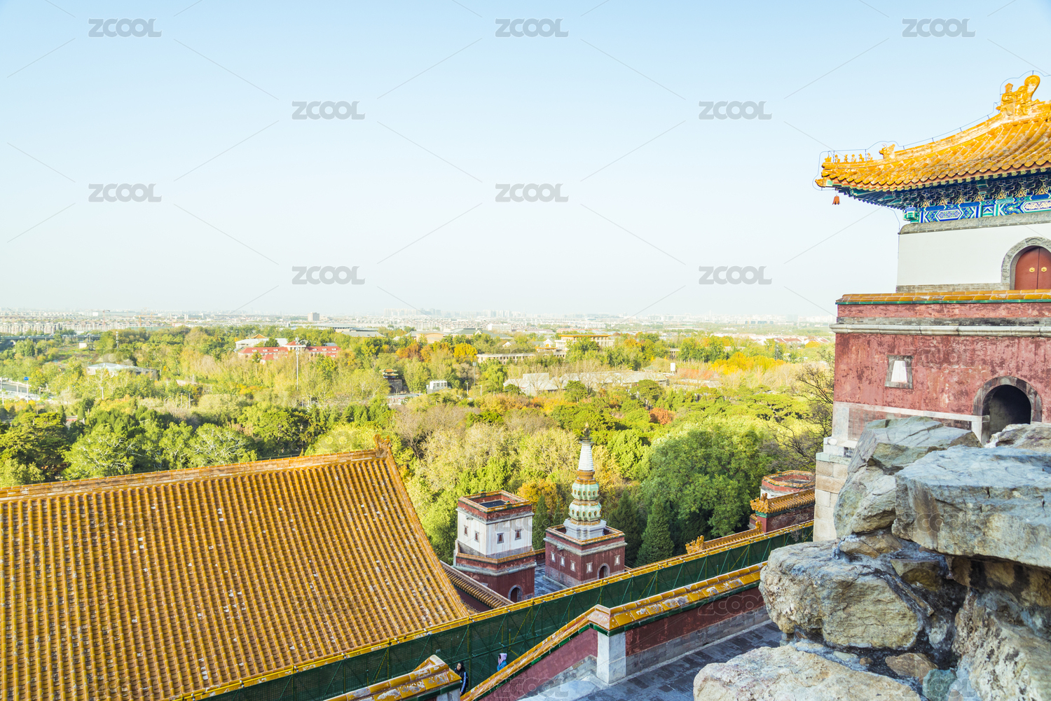 秋天蓝天下的北京颐和园公园的塔寺古建筑