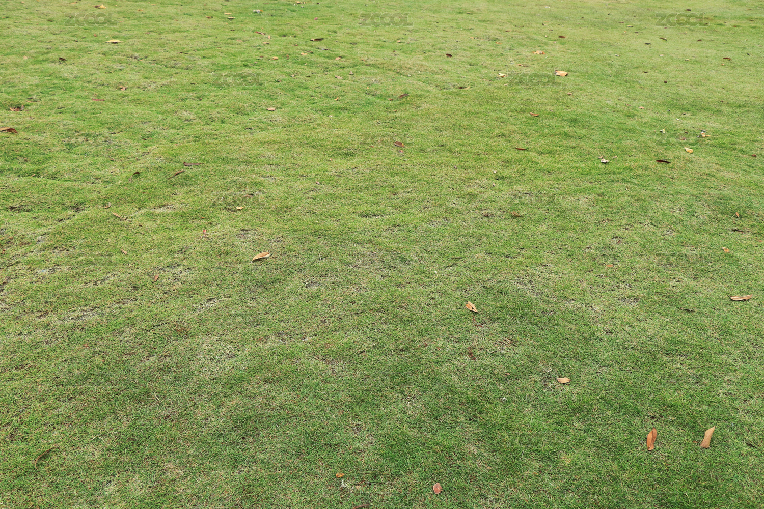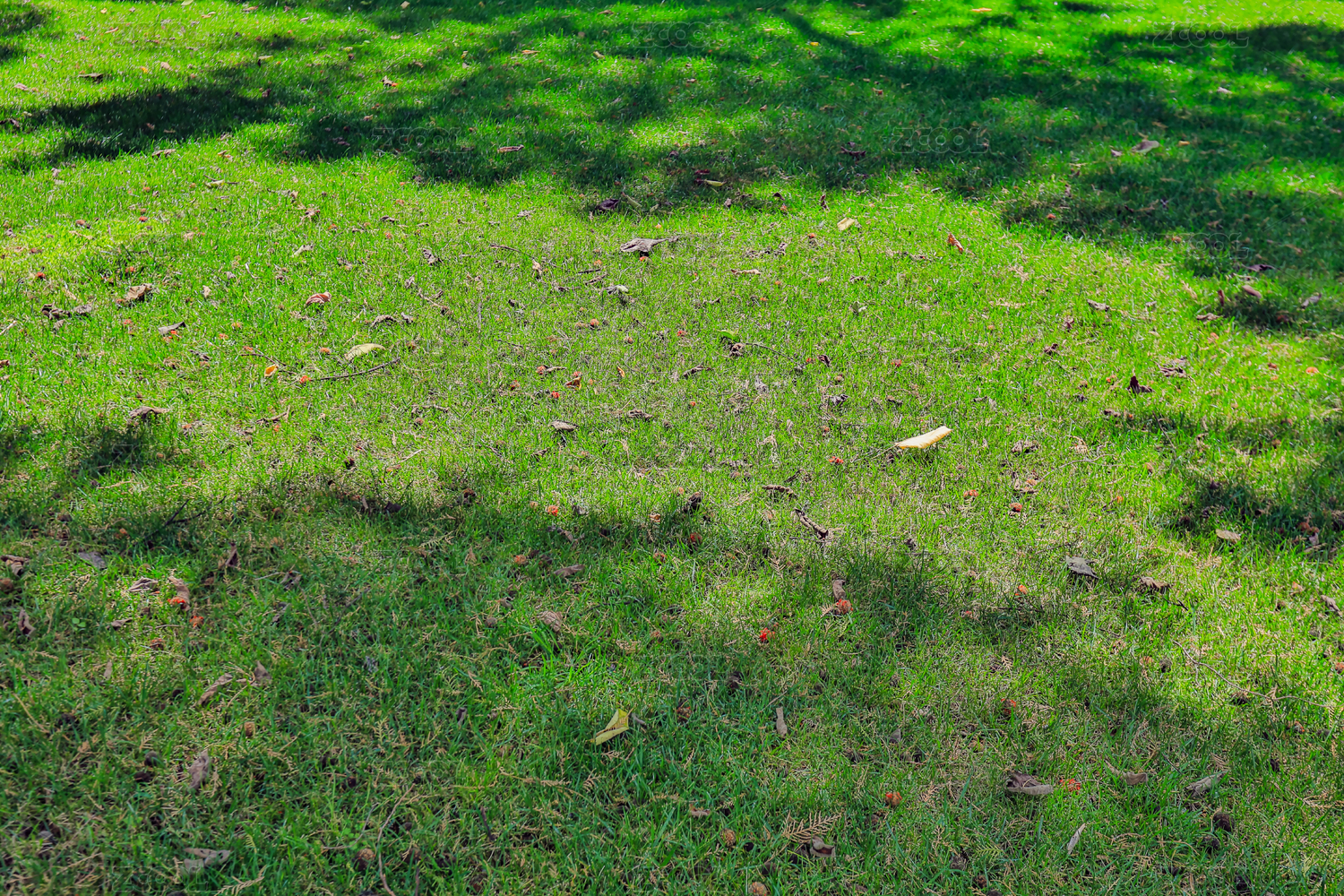 秋天绿色的草坪上有许多枯黄的落叶