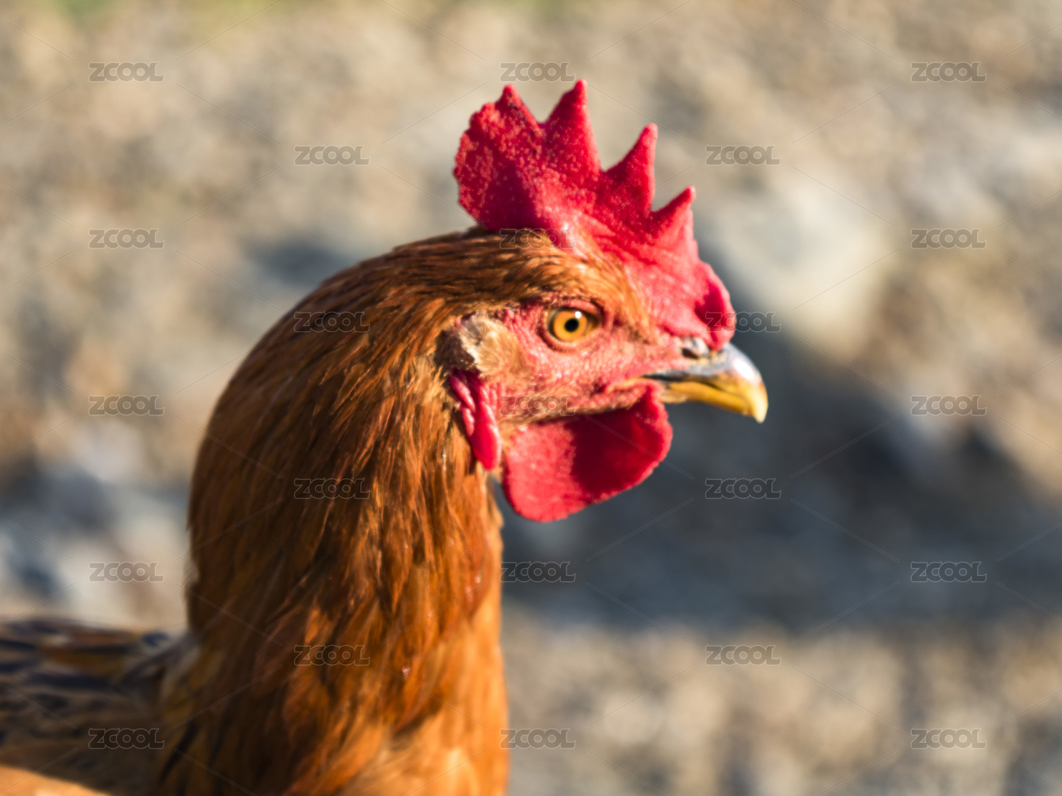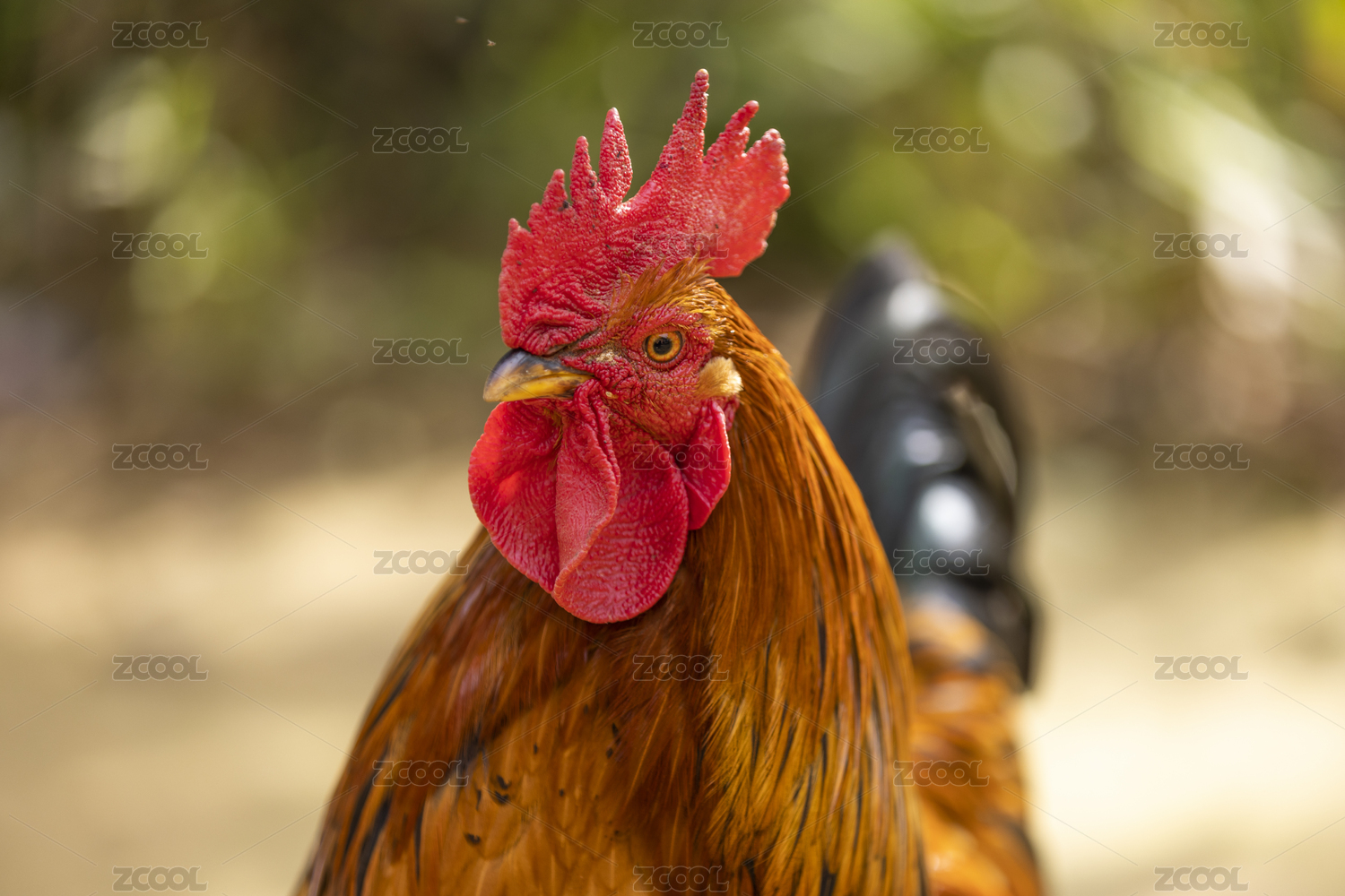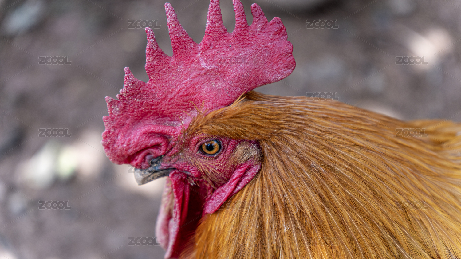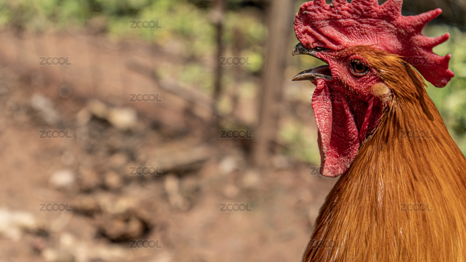 散养在户外山坡上的一只大公鸡的鸡头特写