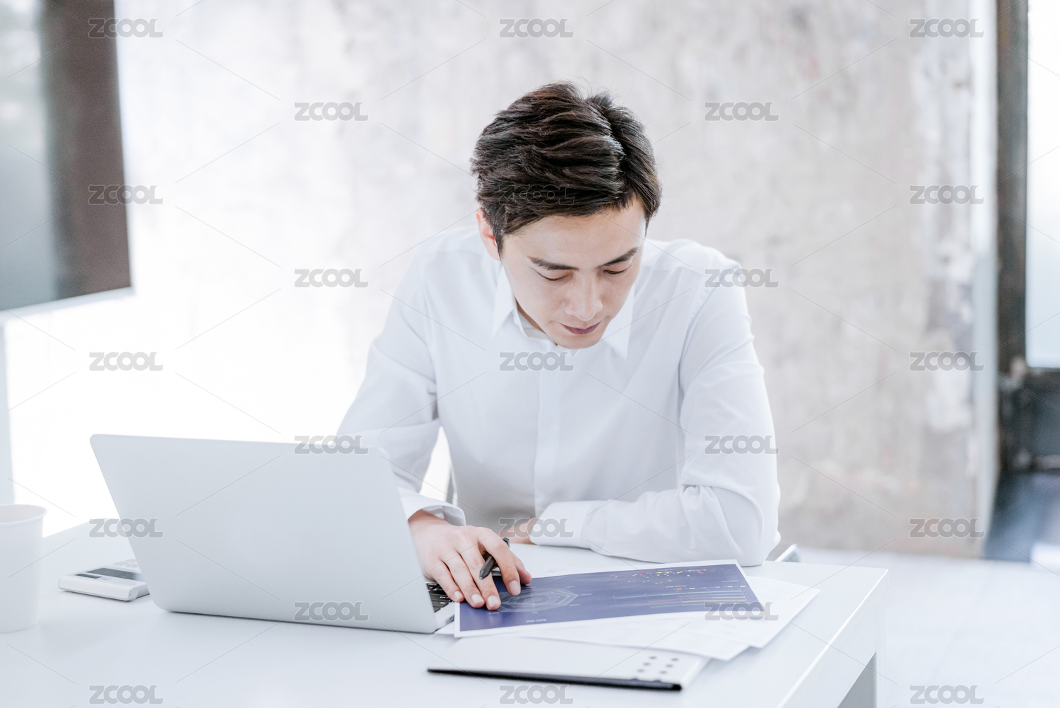 穿白色衬衣使用笔记本电脑工作的年轻男性