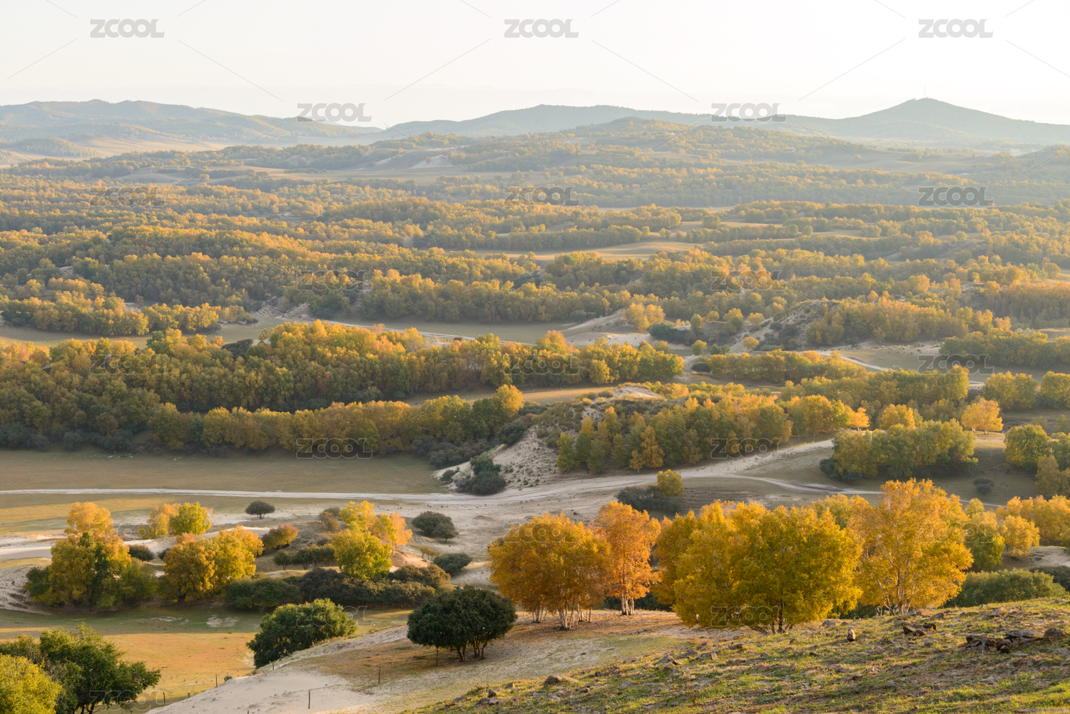 秋天内蒙古乌兰布统坝上草原的山丘草地树林