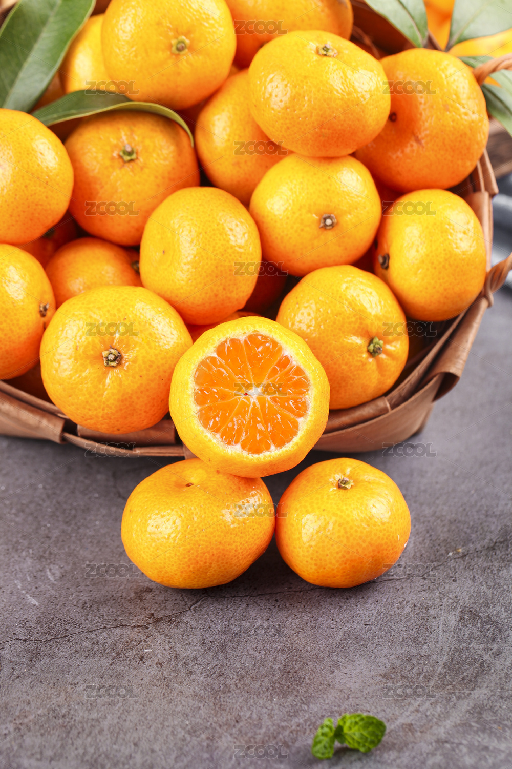 木桌上放在竹筐里的多个切开的雷波脐橙