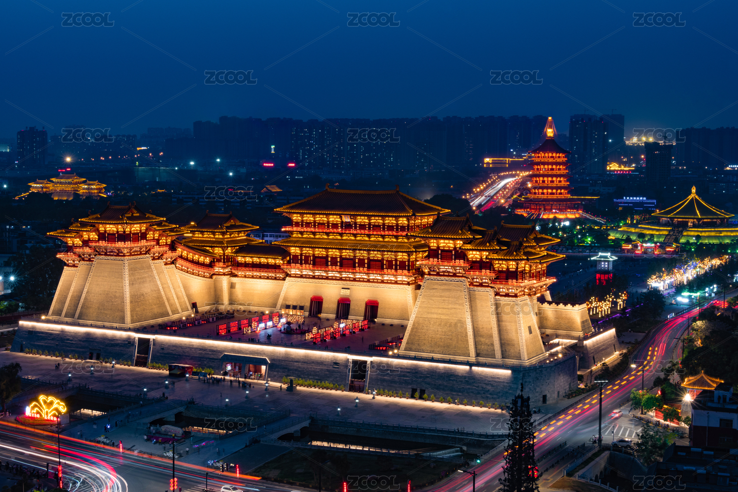 中国洛阳应天门唐代宫殿建筑夜景照明景观