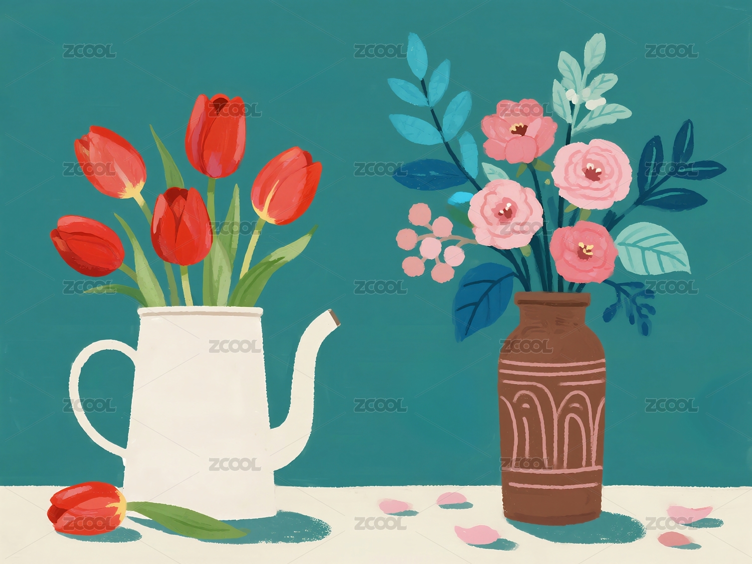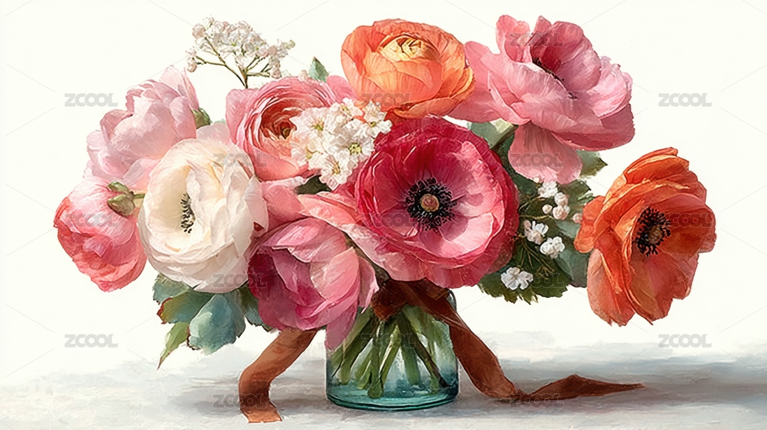 花瓶鲜花唯美插画油画