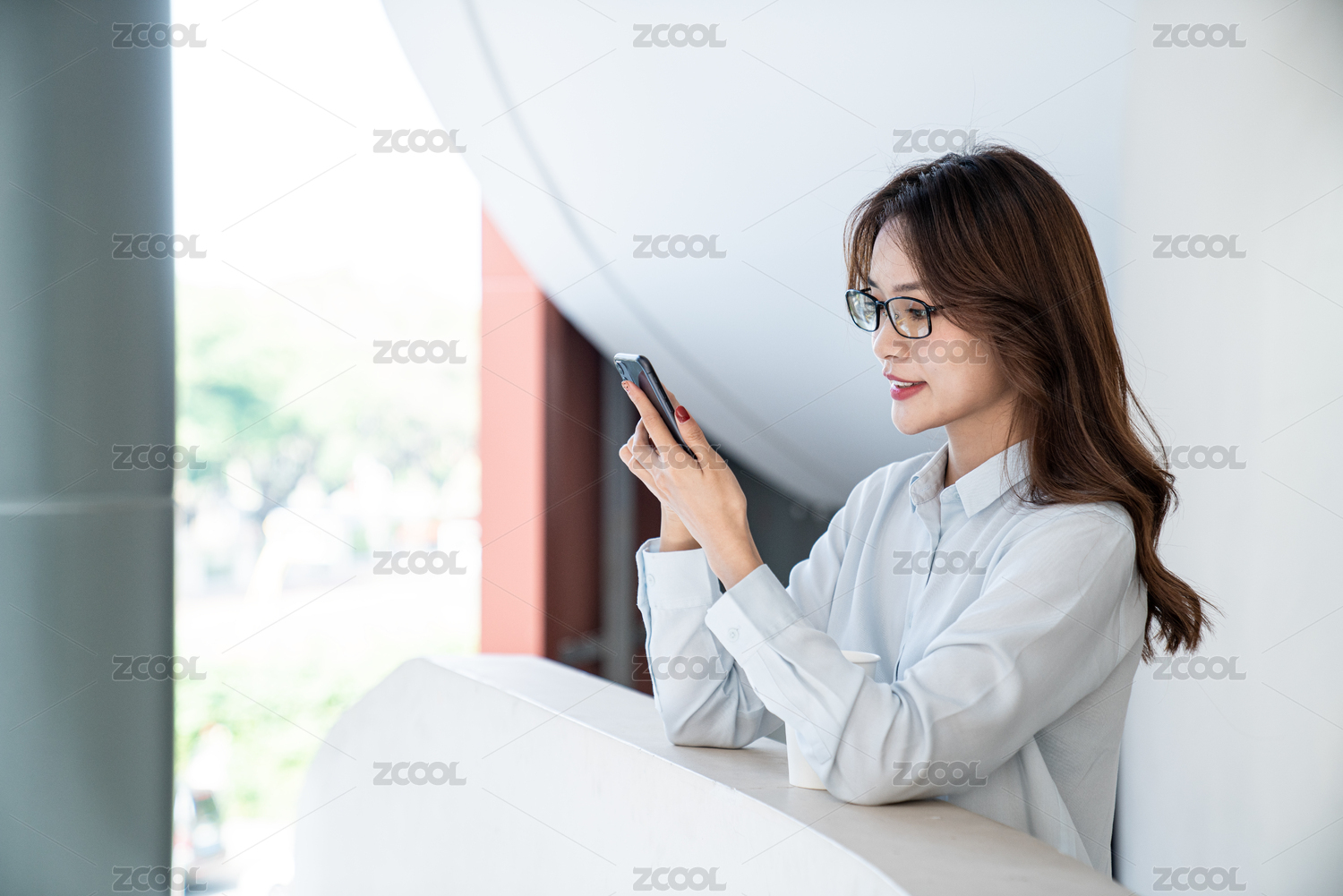 一名年轻的商务女性在室外的走廊上使用手机