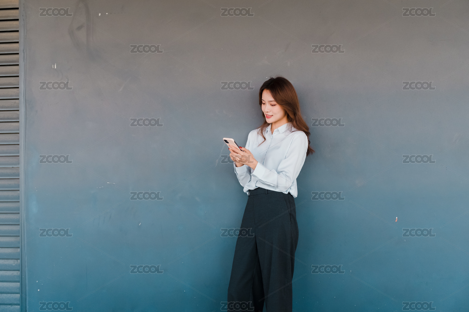 一名年轻的商务女性在室外站立使用手机