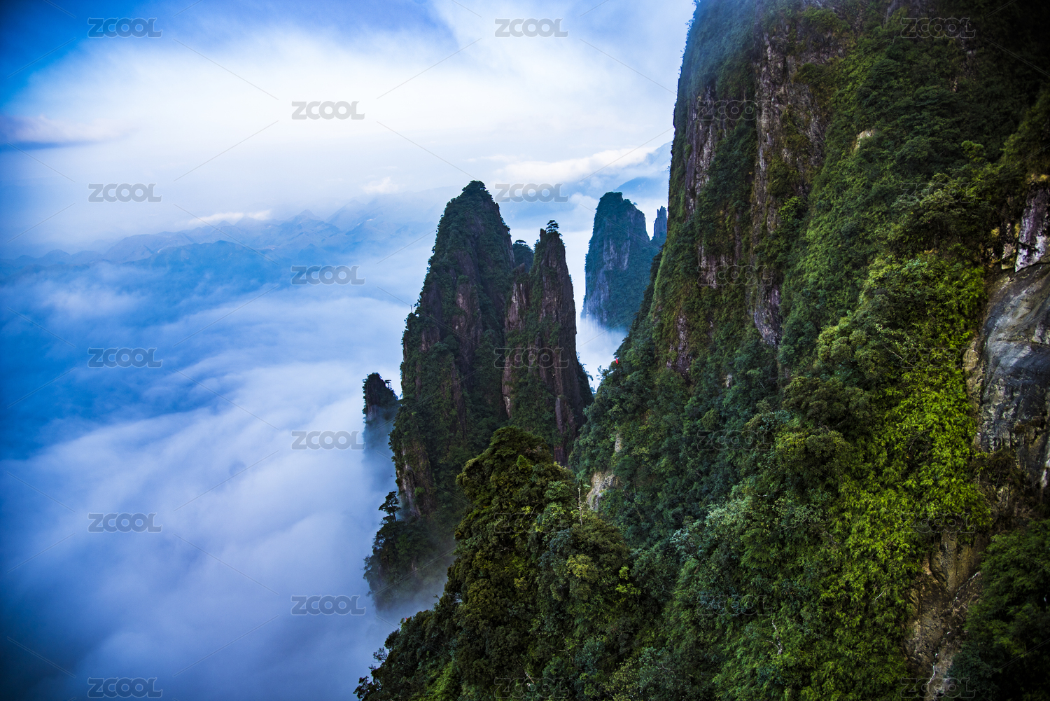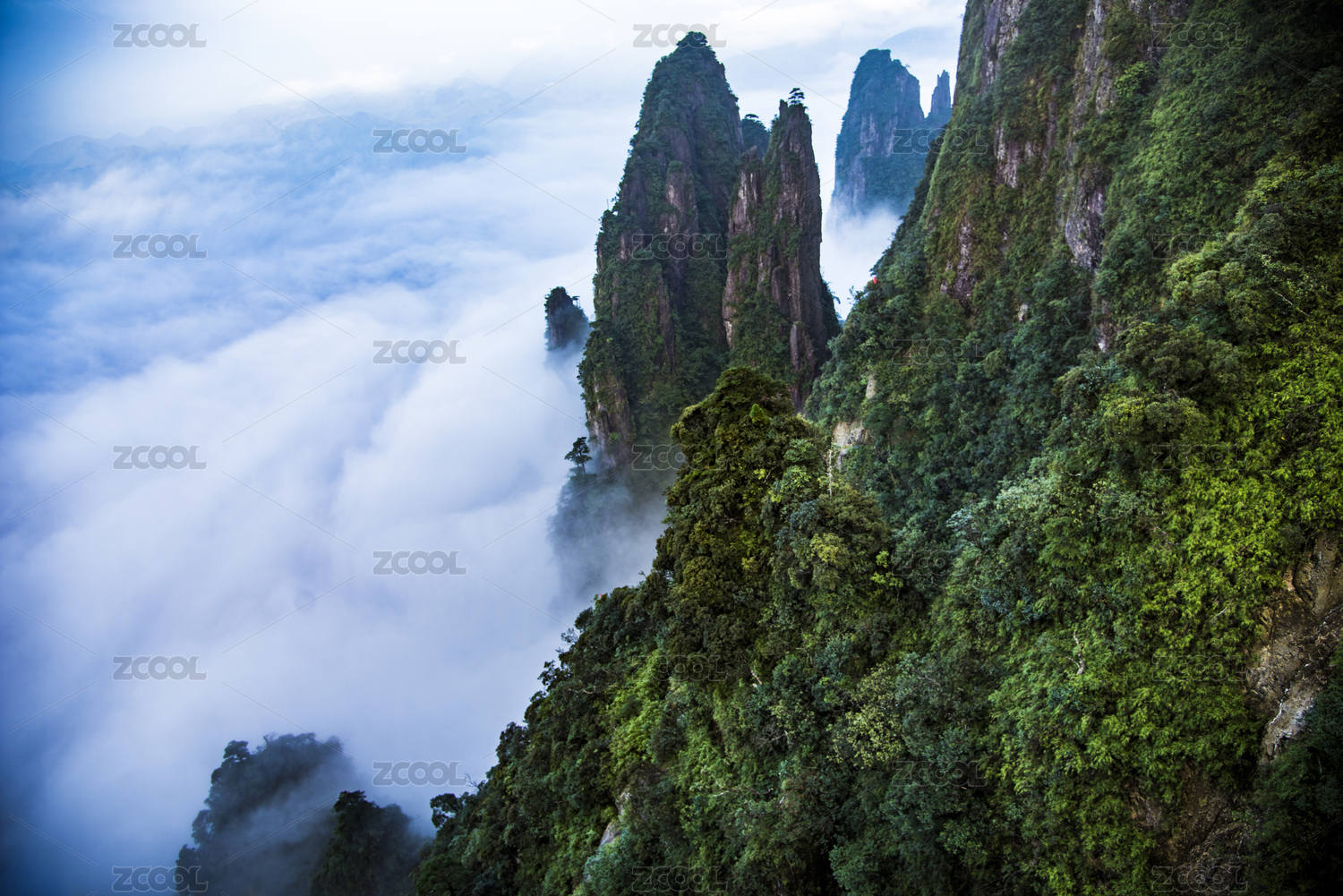 中国江西三清山上云雾缭绕的山峰与枯枝