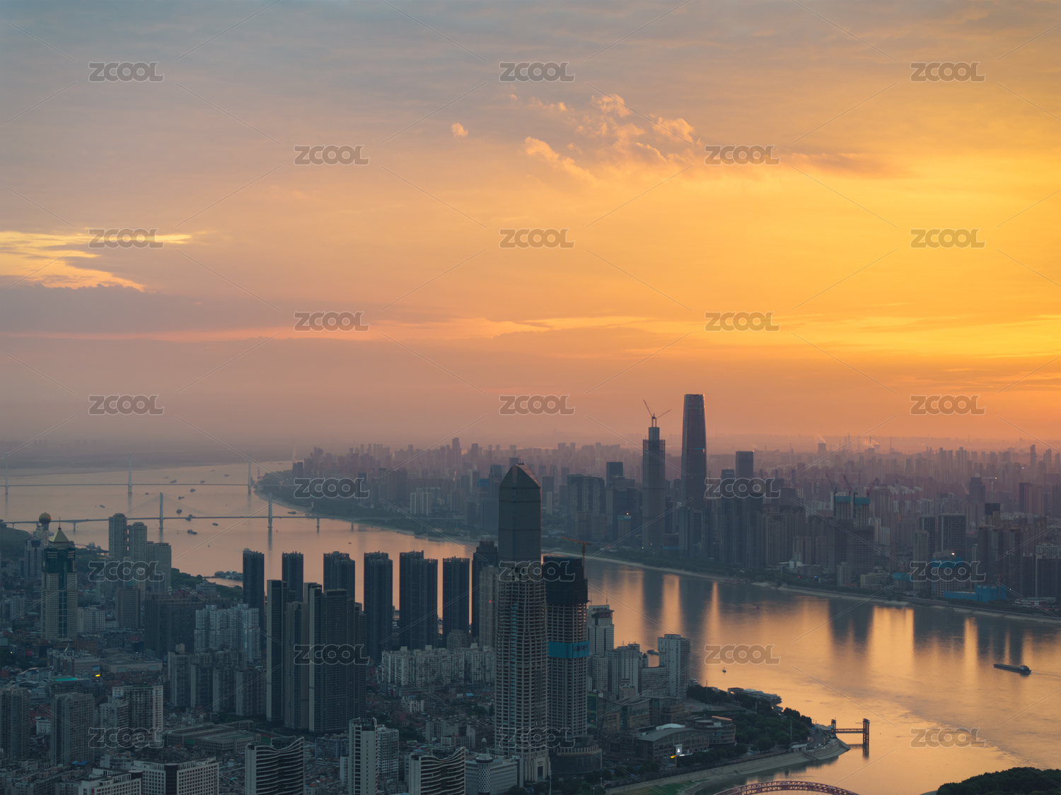 夏季武汉日落平流雾中的城市天际线航拍视角