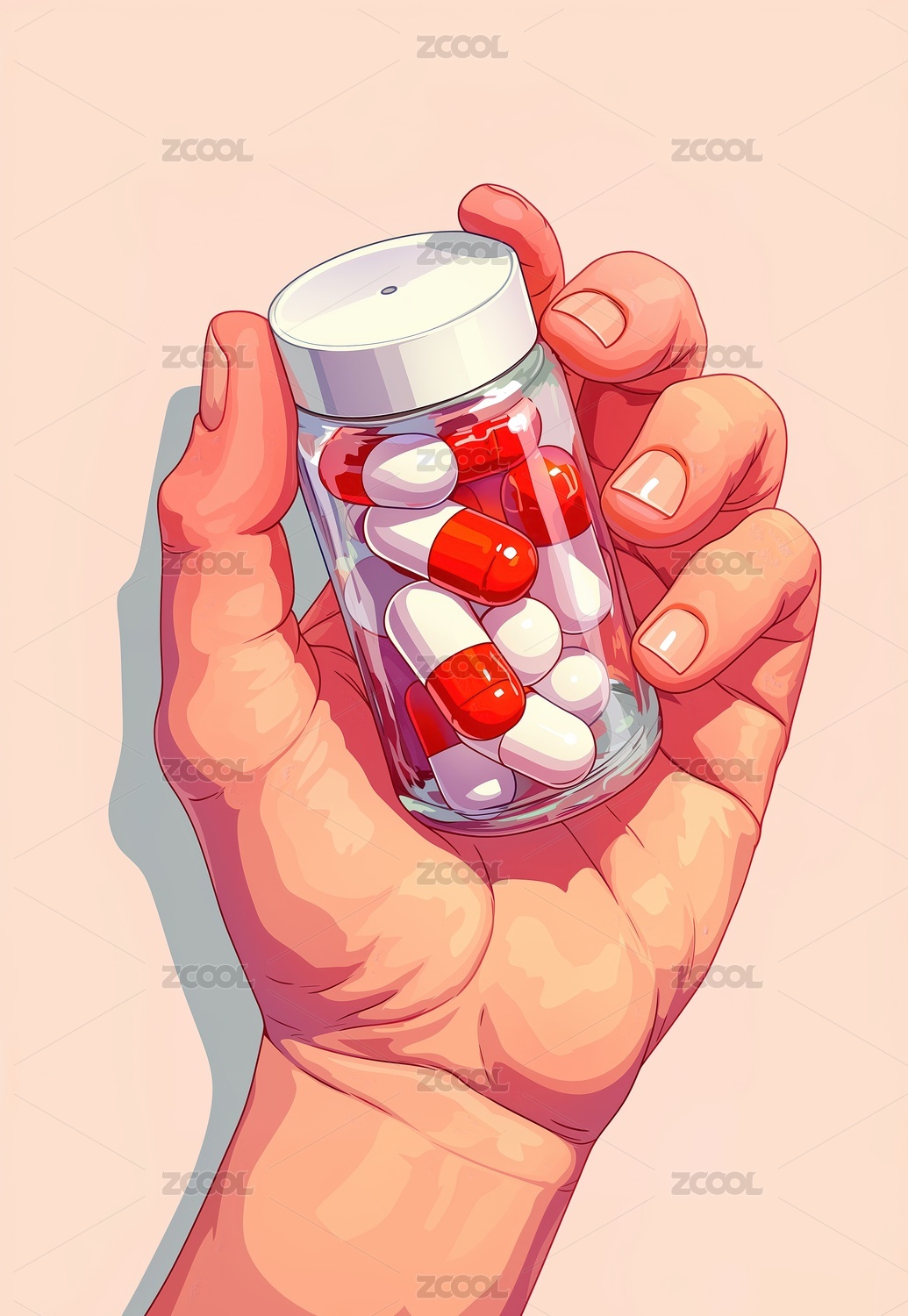 清新明亮手掌中的药物胶囊扁平插画绘画