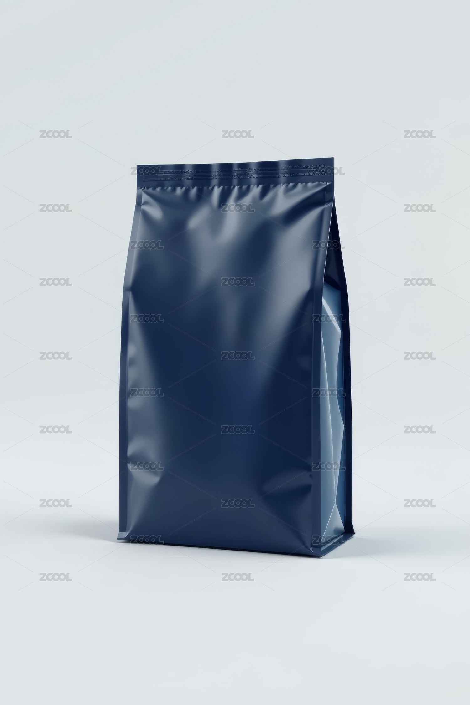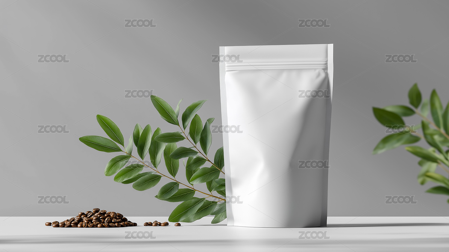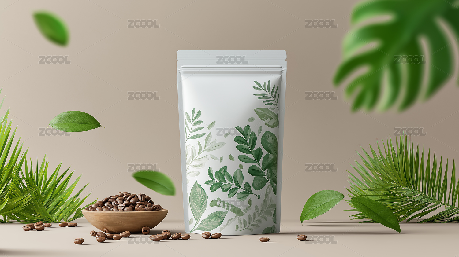 浅棕背景绿叶图案包装袋配咖啡豆与绿植