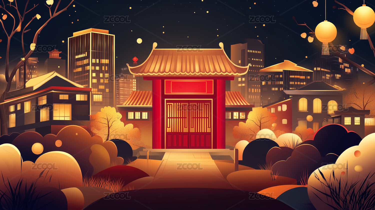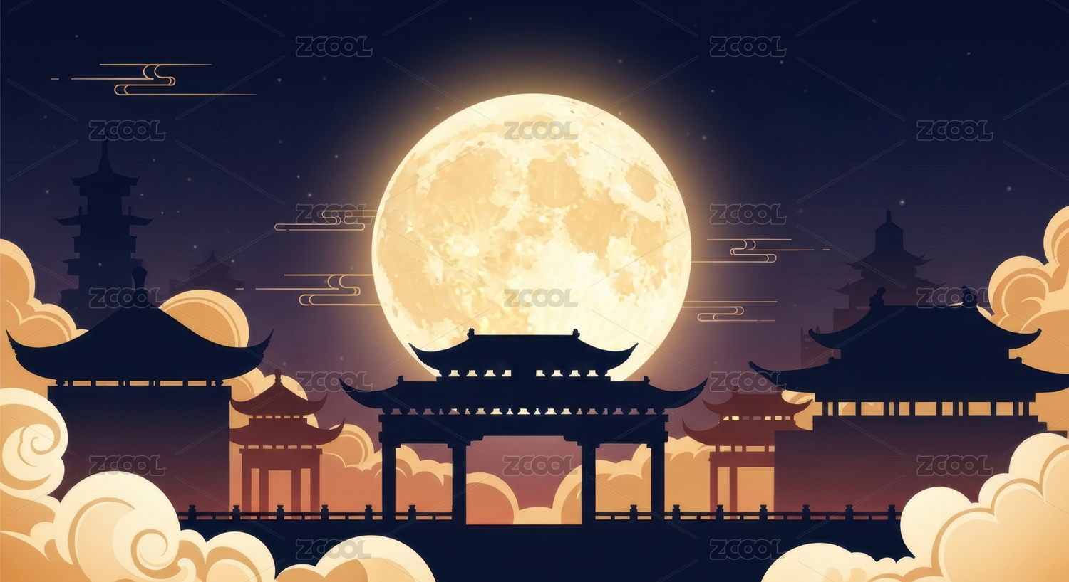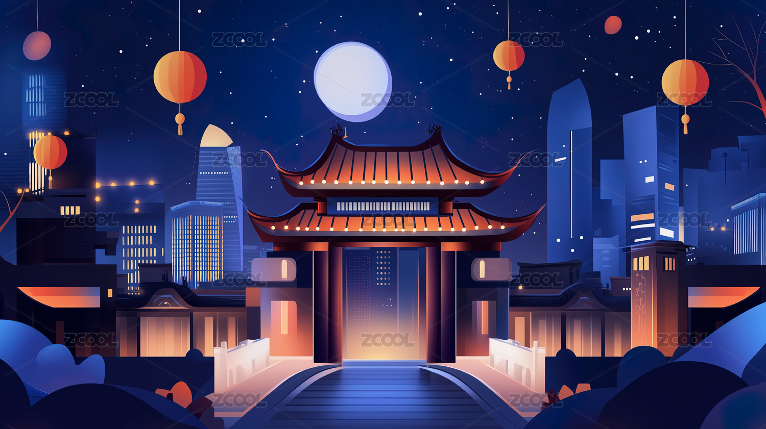 中秋节古城矢量插画