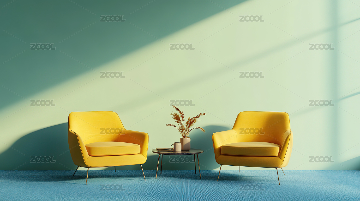 绿色墙壁房间的黄色座椅