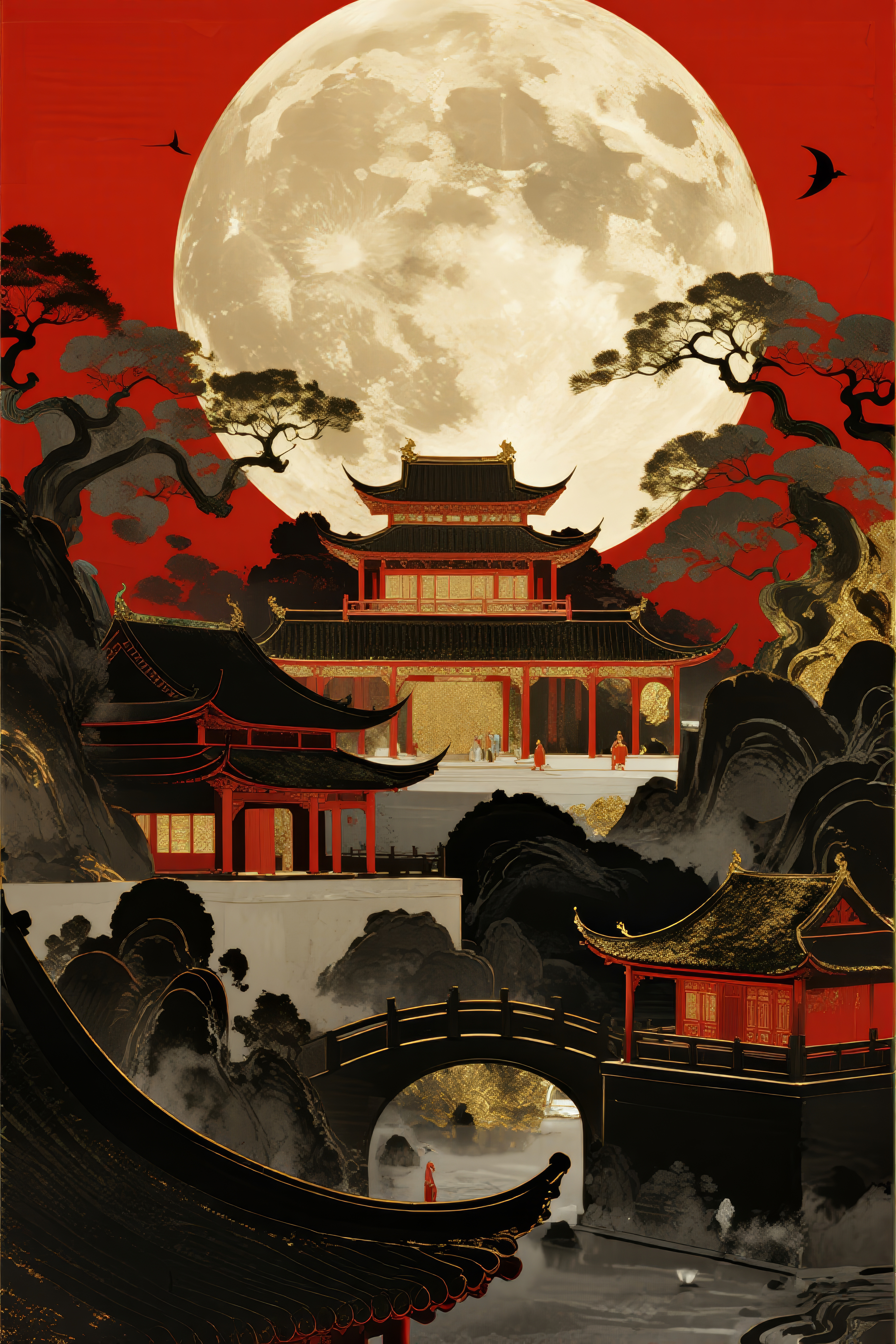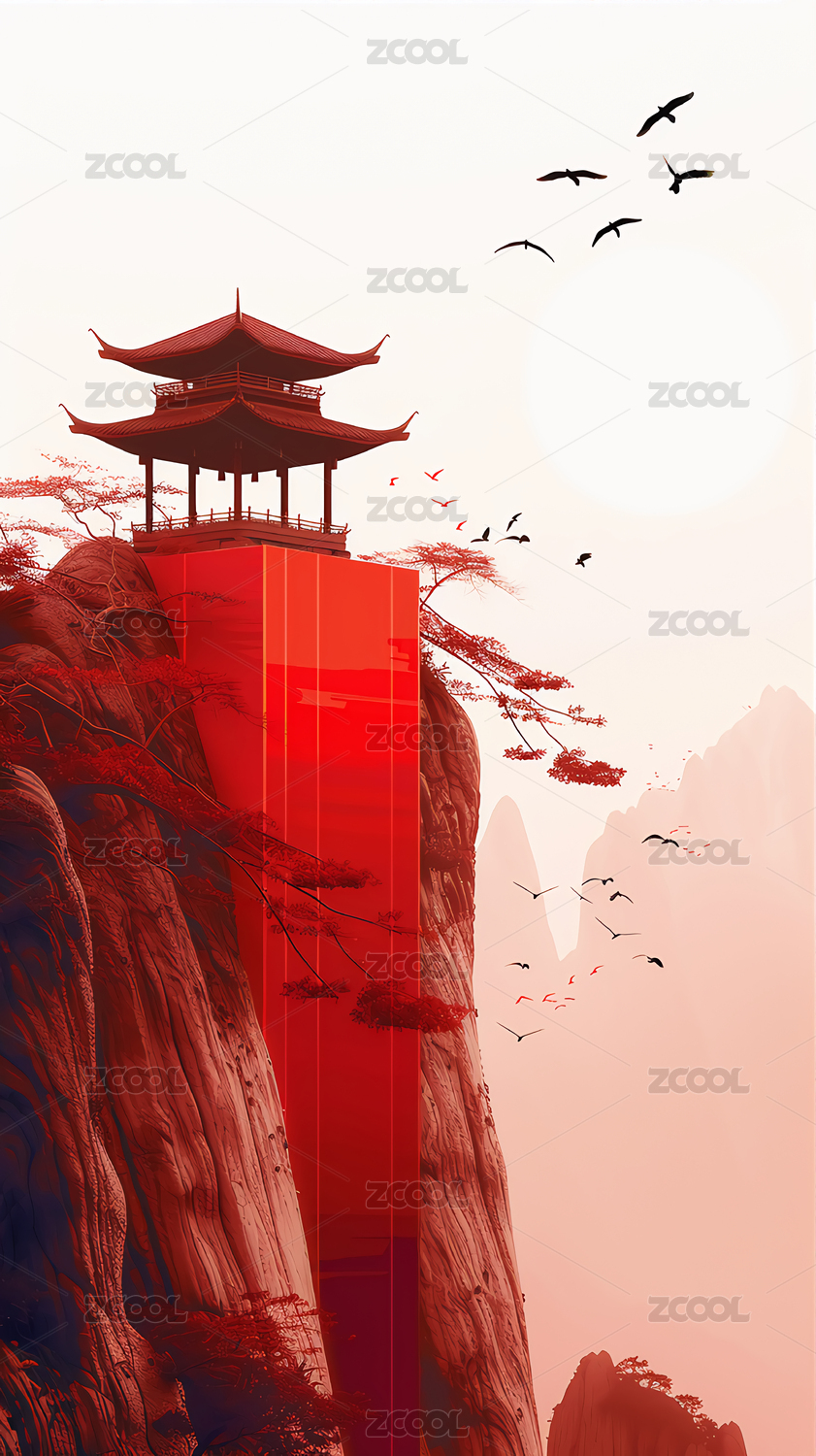 中国红,年画,新年,党建,日出,黎明,山川河流,亭台楼阁,长城,金色