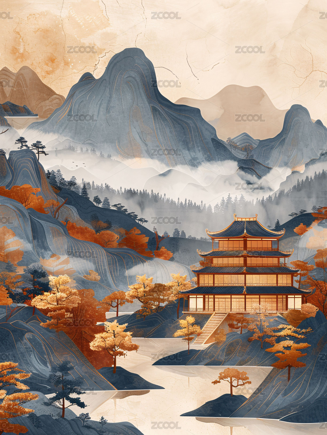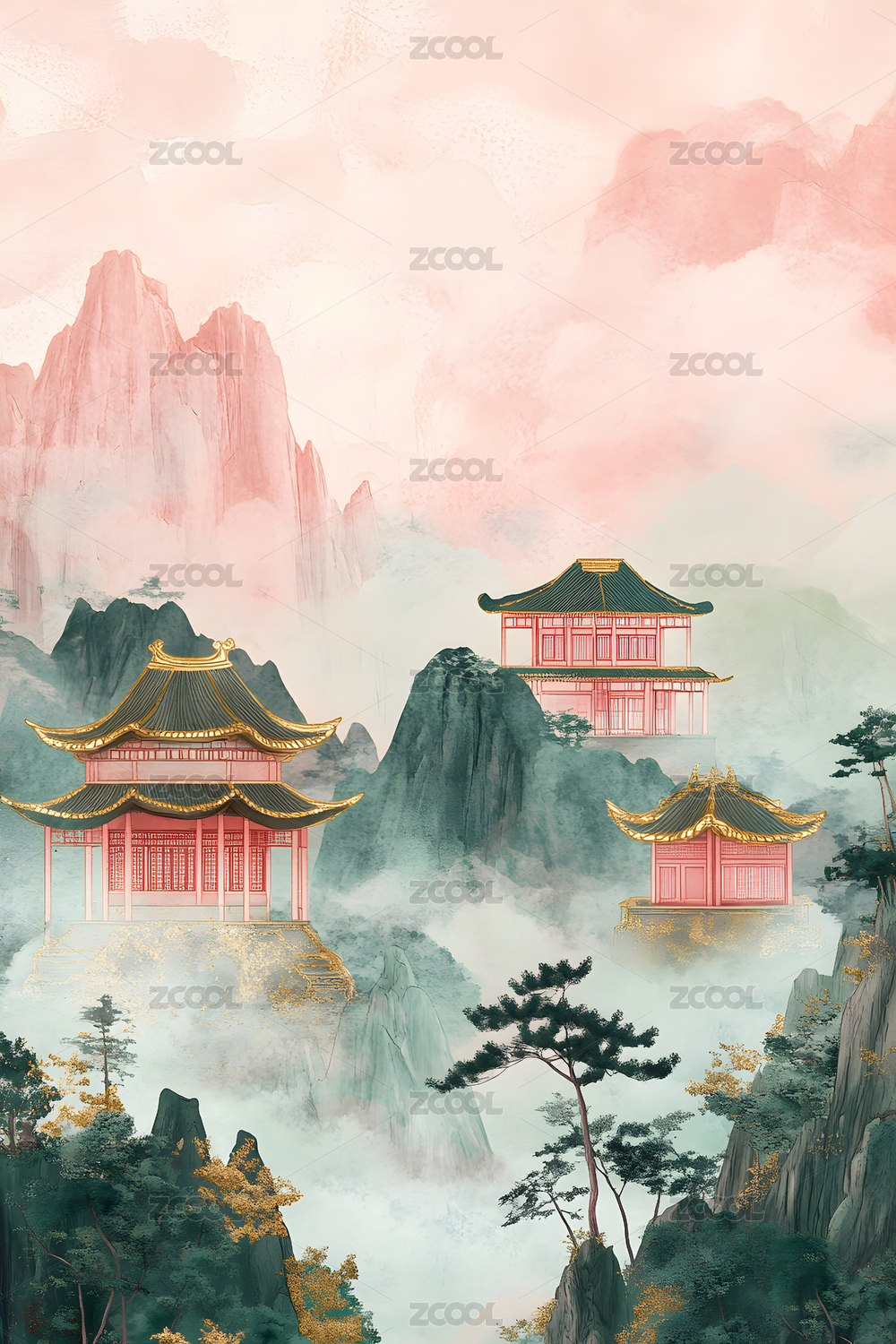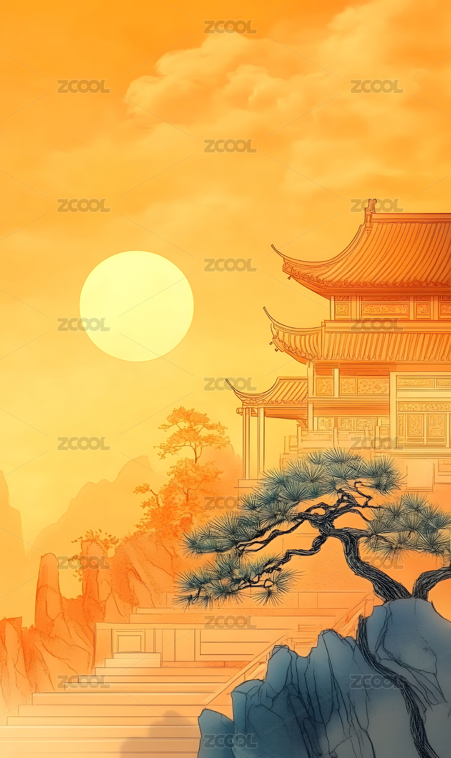 中国风古楼建筑传统国风古建筑国潮插画背景