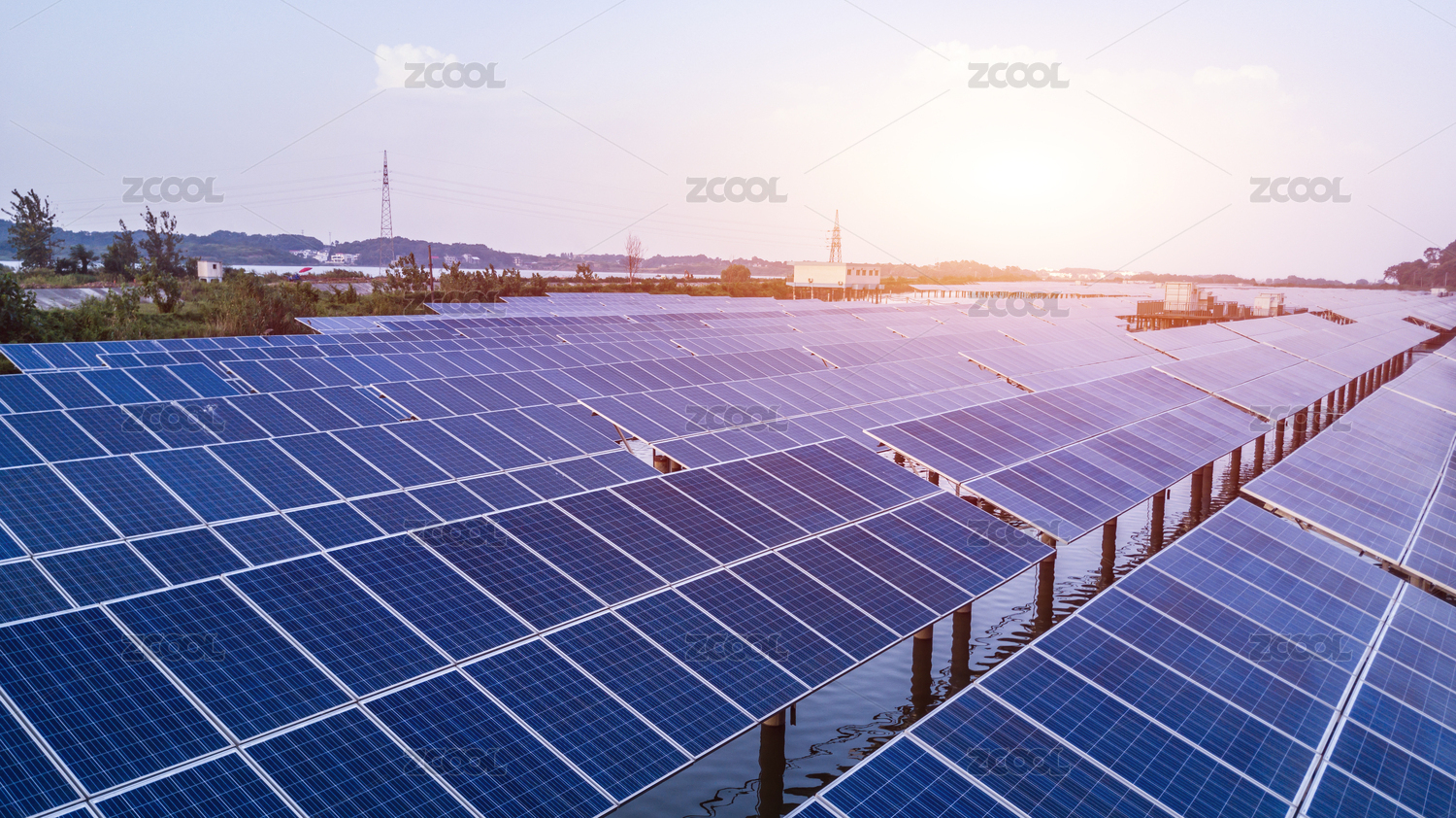 日落时湖面上排列整齐的太阳能电池板