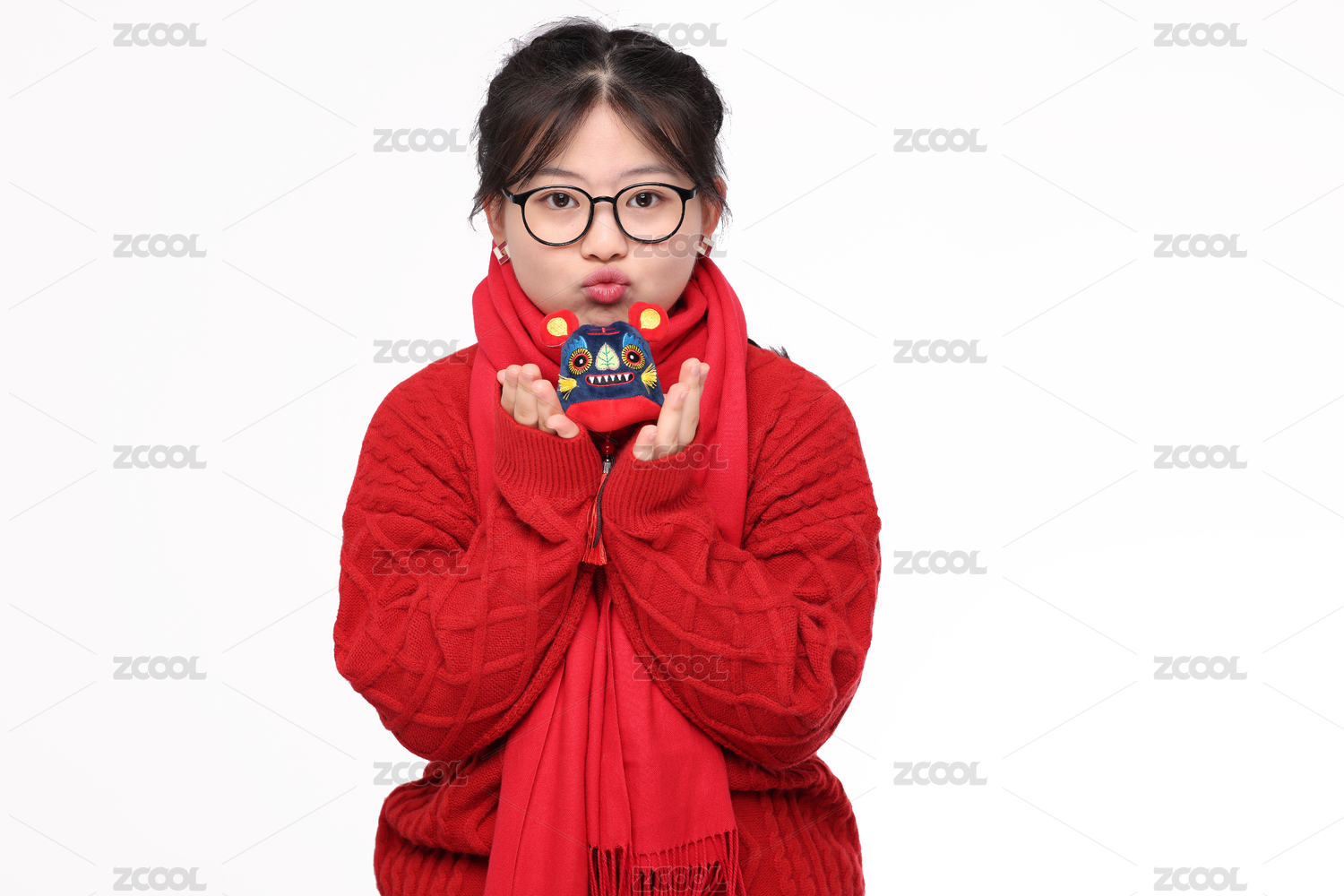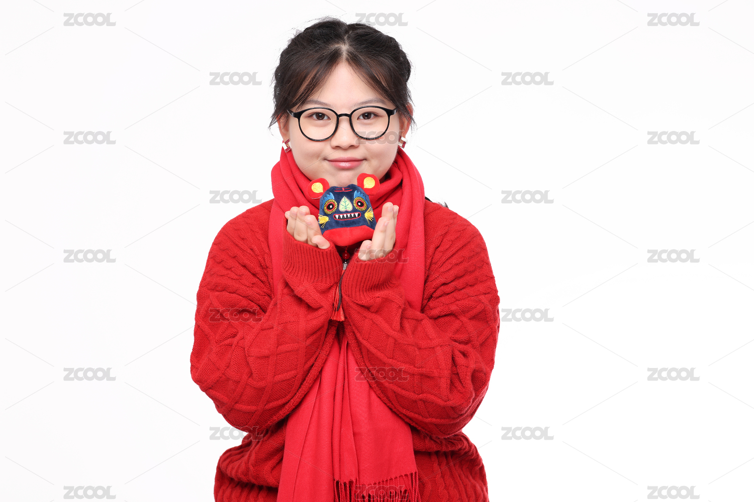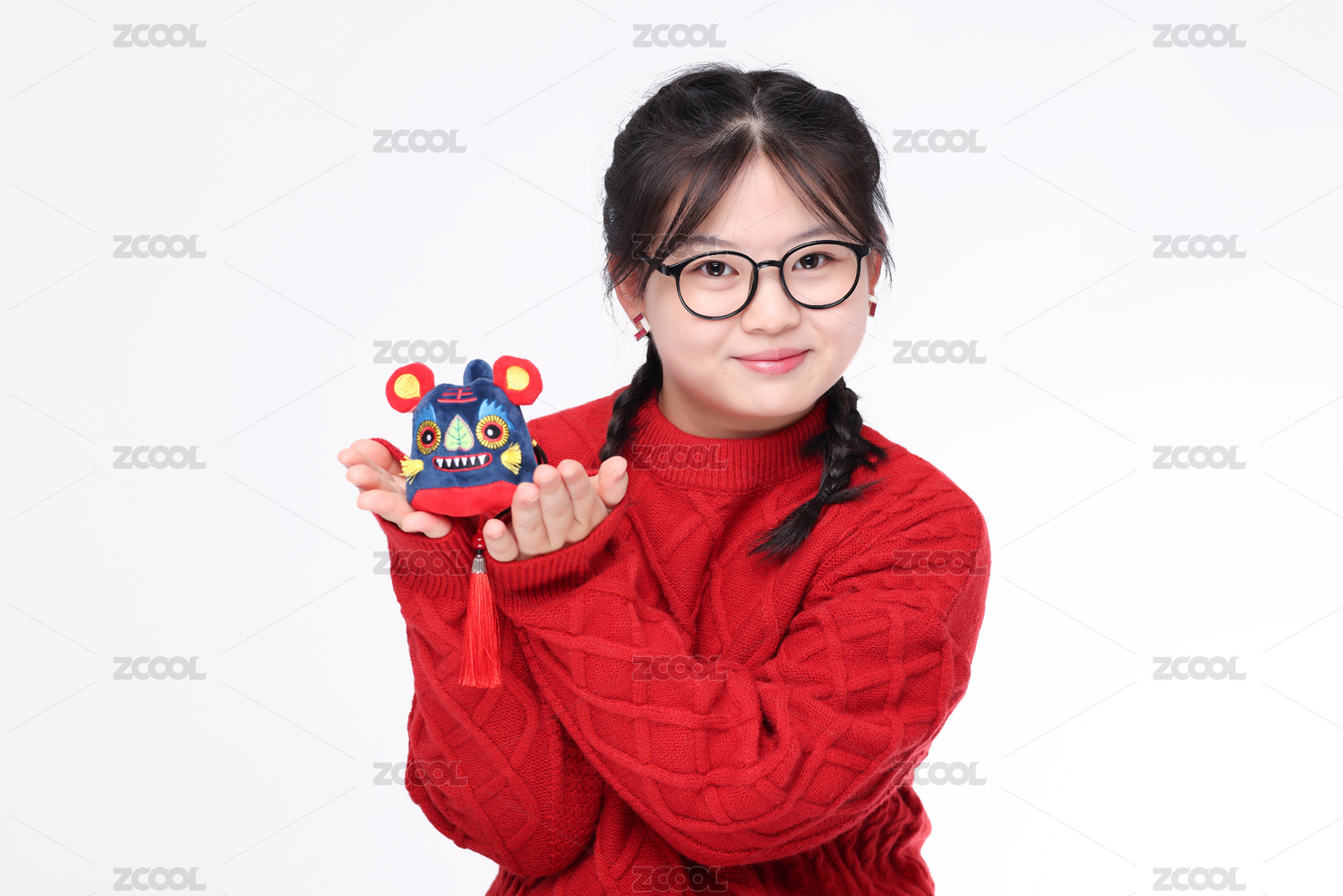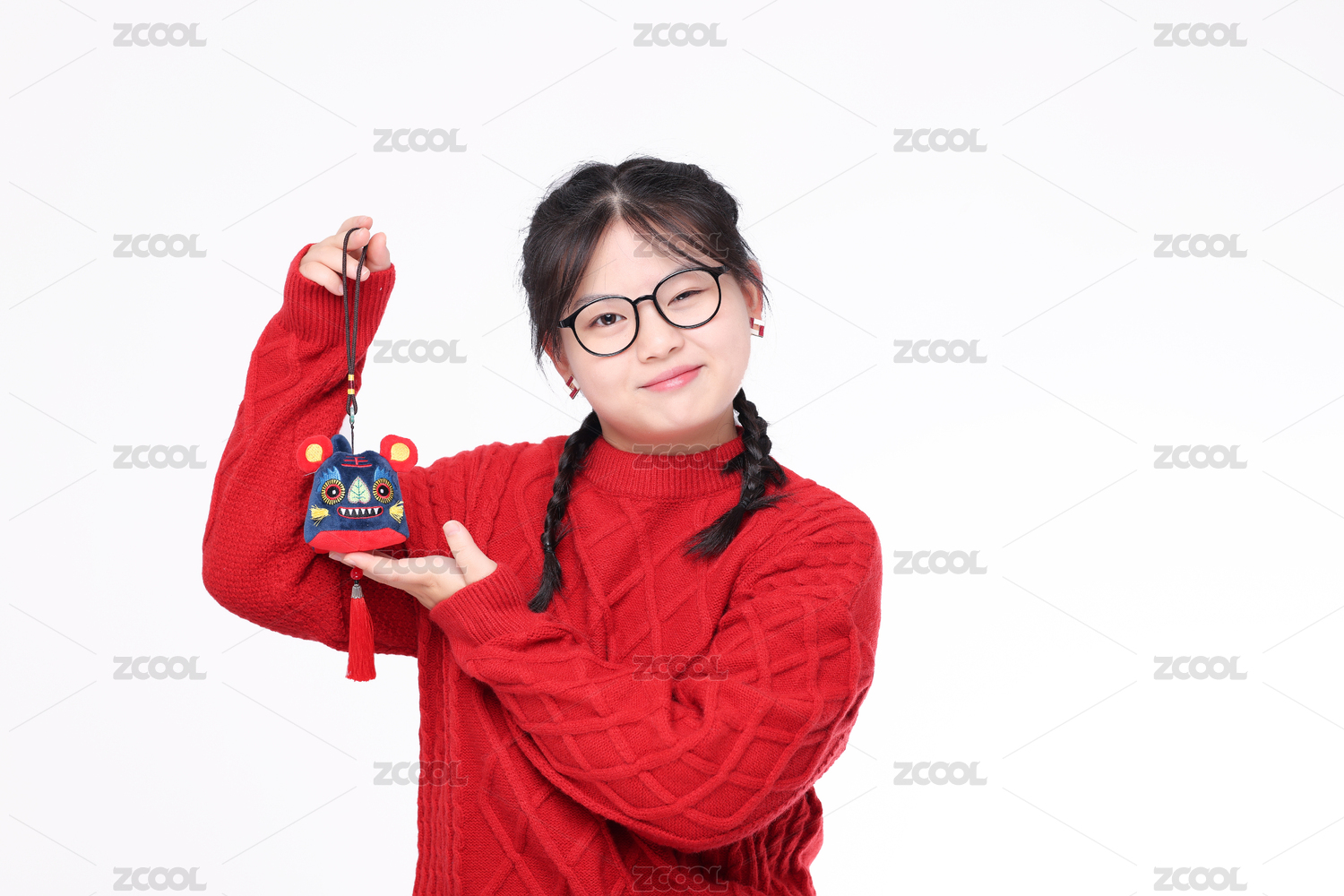 白色背景下 身穿红色毛衣的中国女孩