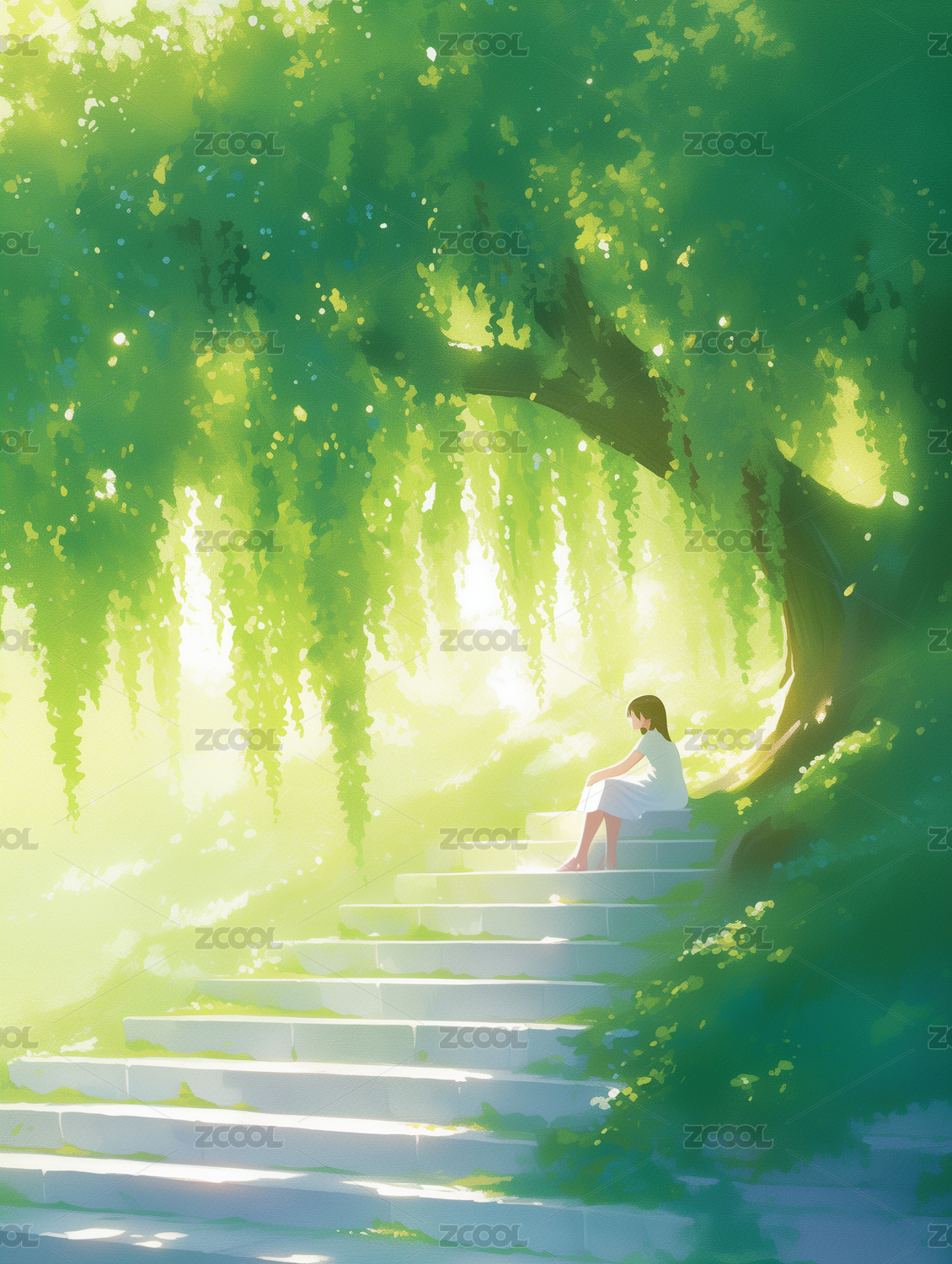 公园,插画,艺术,生活,草地,绿色,植物,树木,台阶,人物