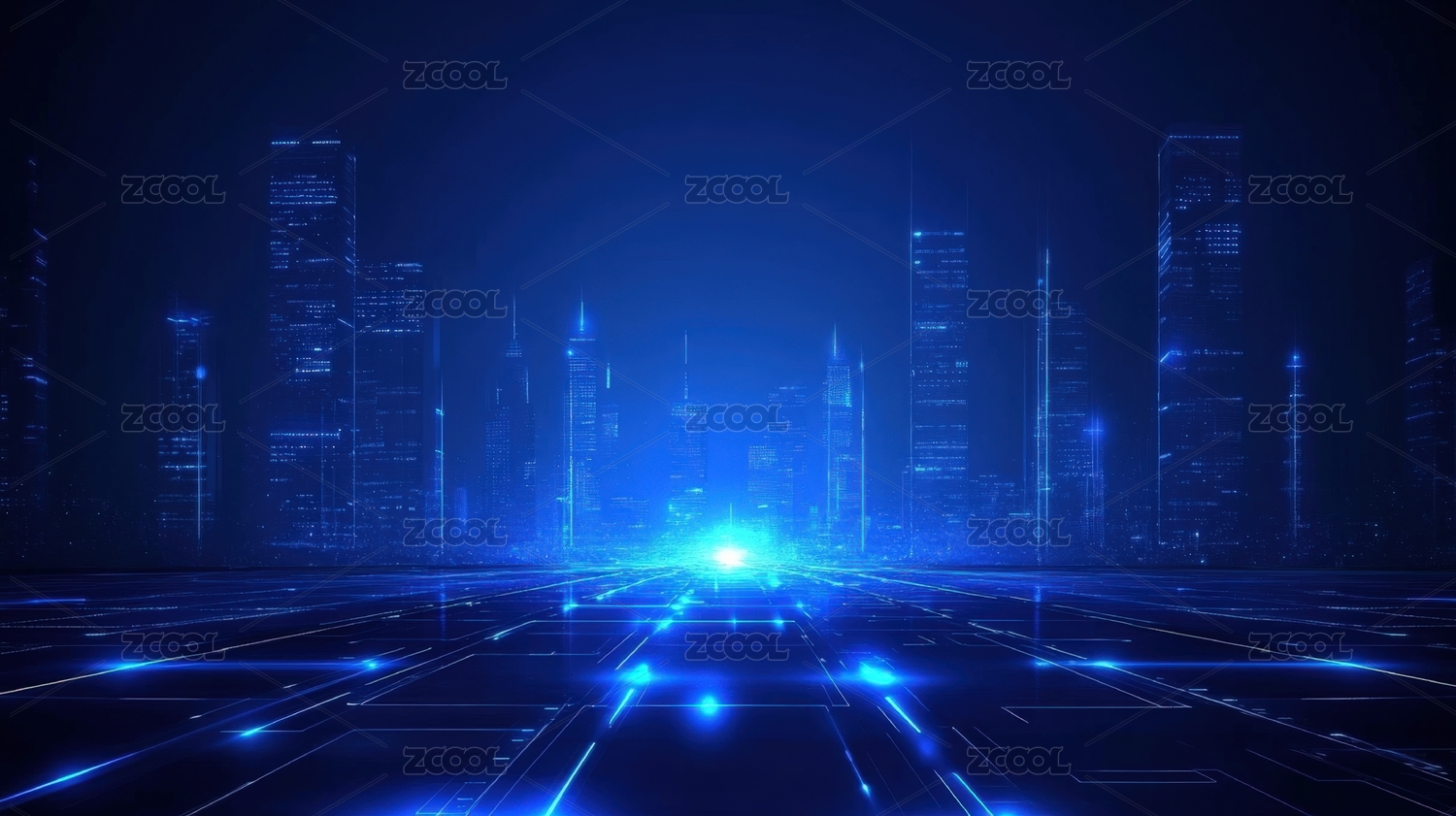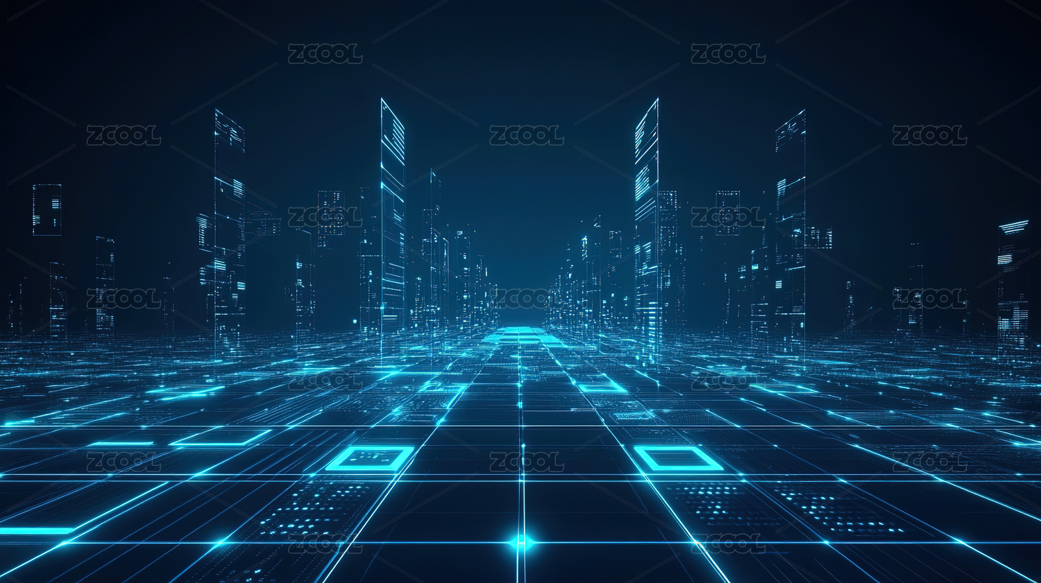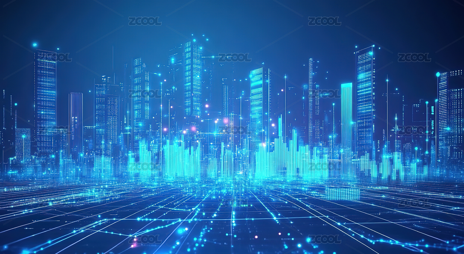 现代城市建筑蓝灯3D技术摩天大楼智能数据