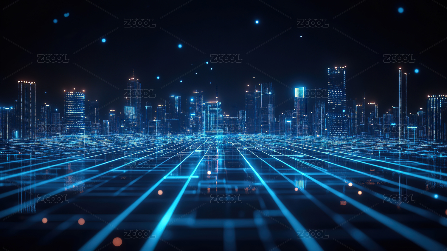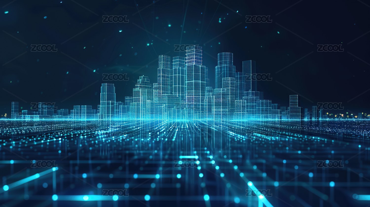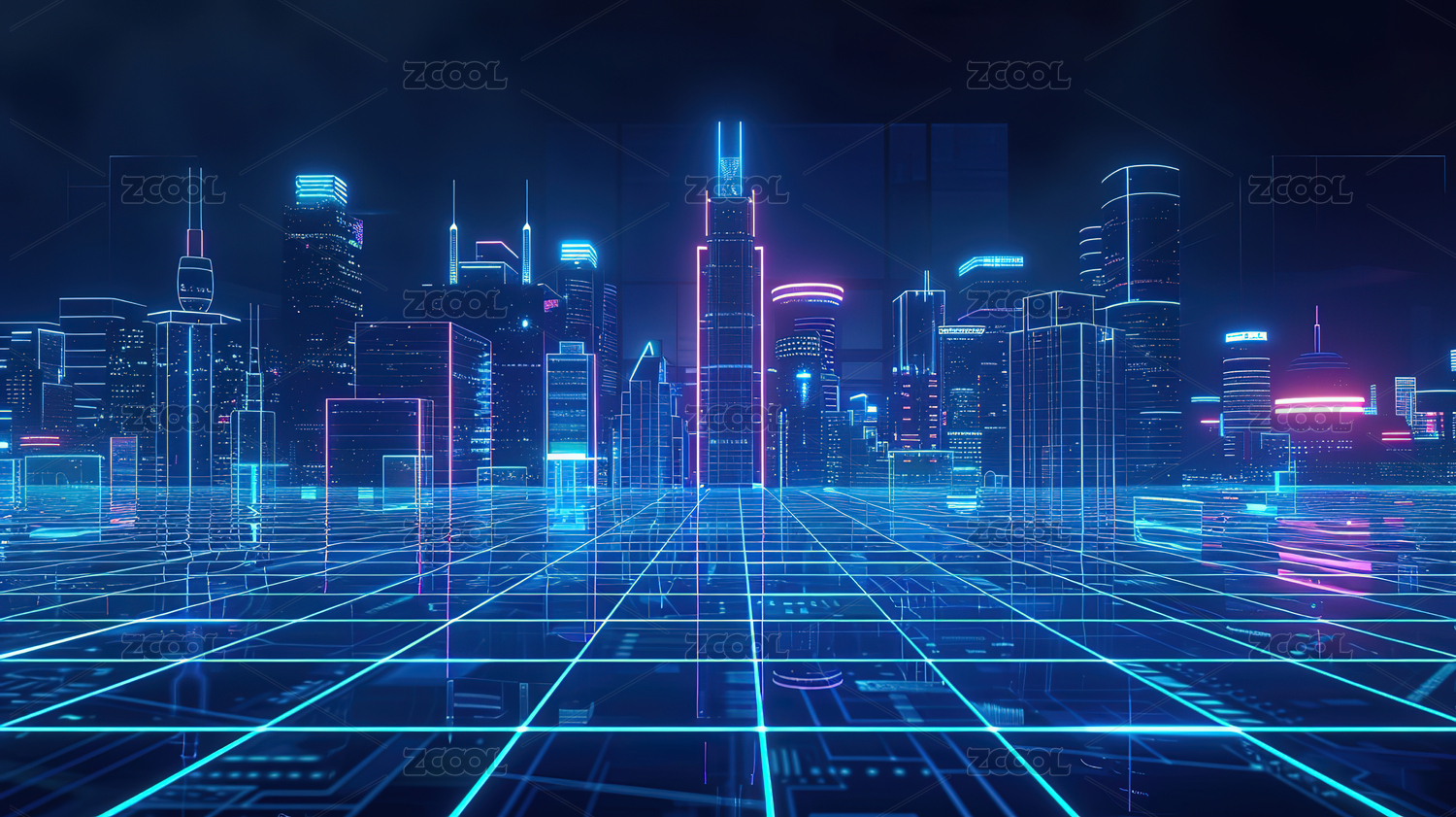 现代城市建筑蓝灯3D技术摩天大楼智能数据