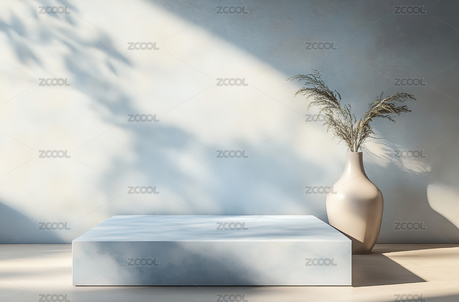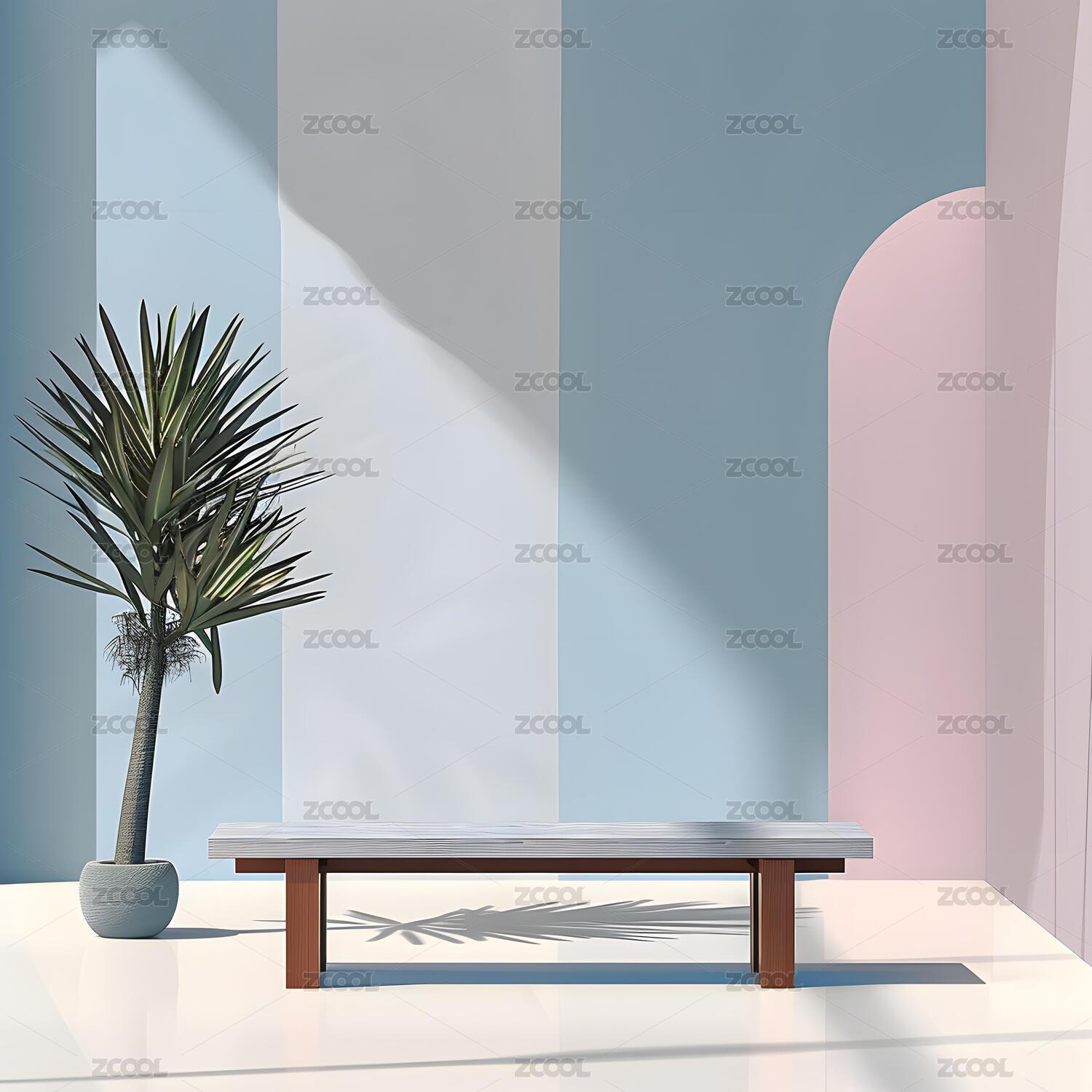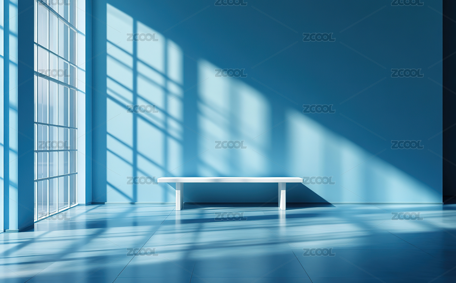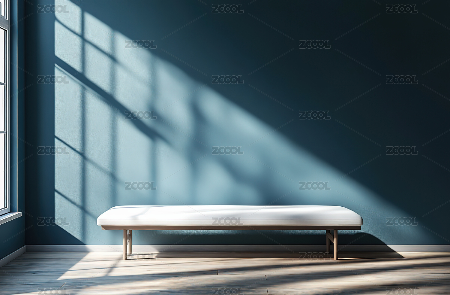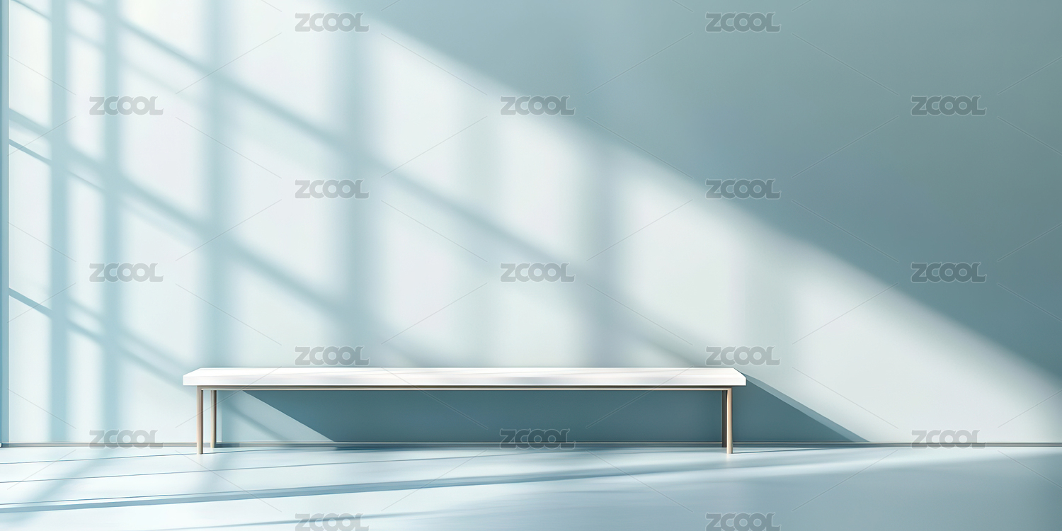 一张极简现代长凳置于浅蓝色墙壁的空房间中