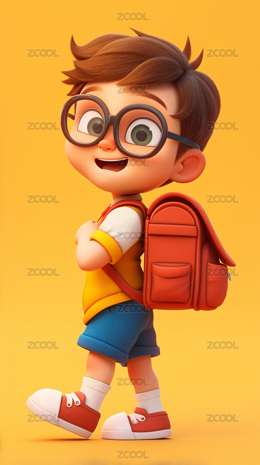 3D卡通可爱背着书包的小男孩插画