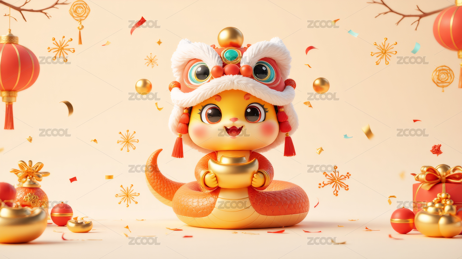 头戴舞狮帽的蛇年主题吉祥物