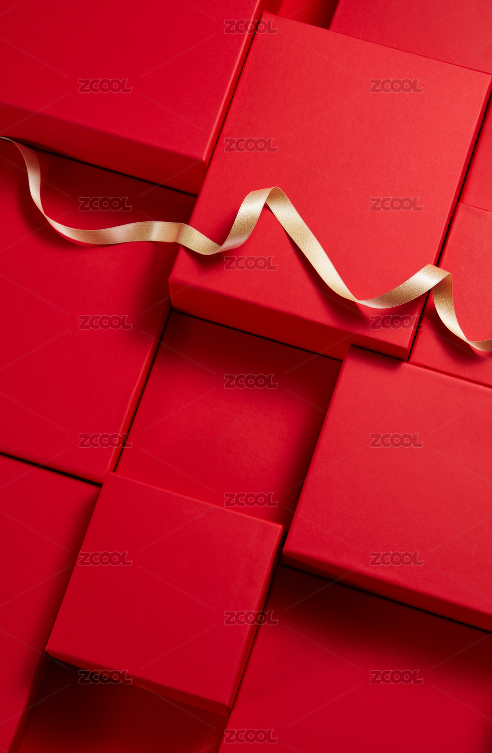 放在红色背景的绑着香槟色带子的红色礼物盒局部
