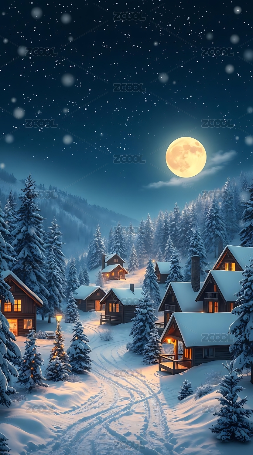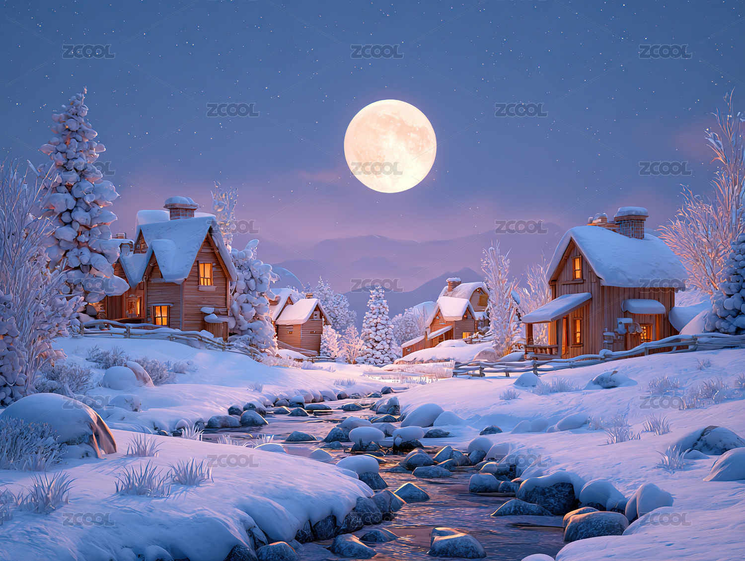 梦幻冬日雪夜下的温馨小街灯光映照宁静雪景