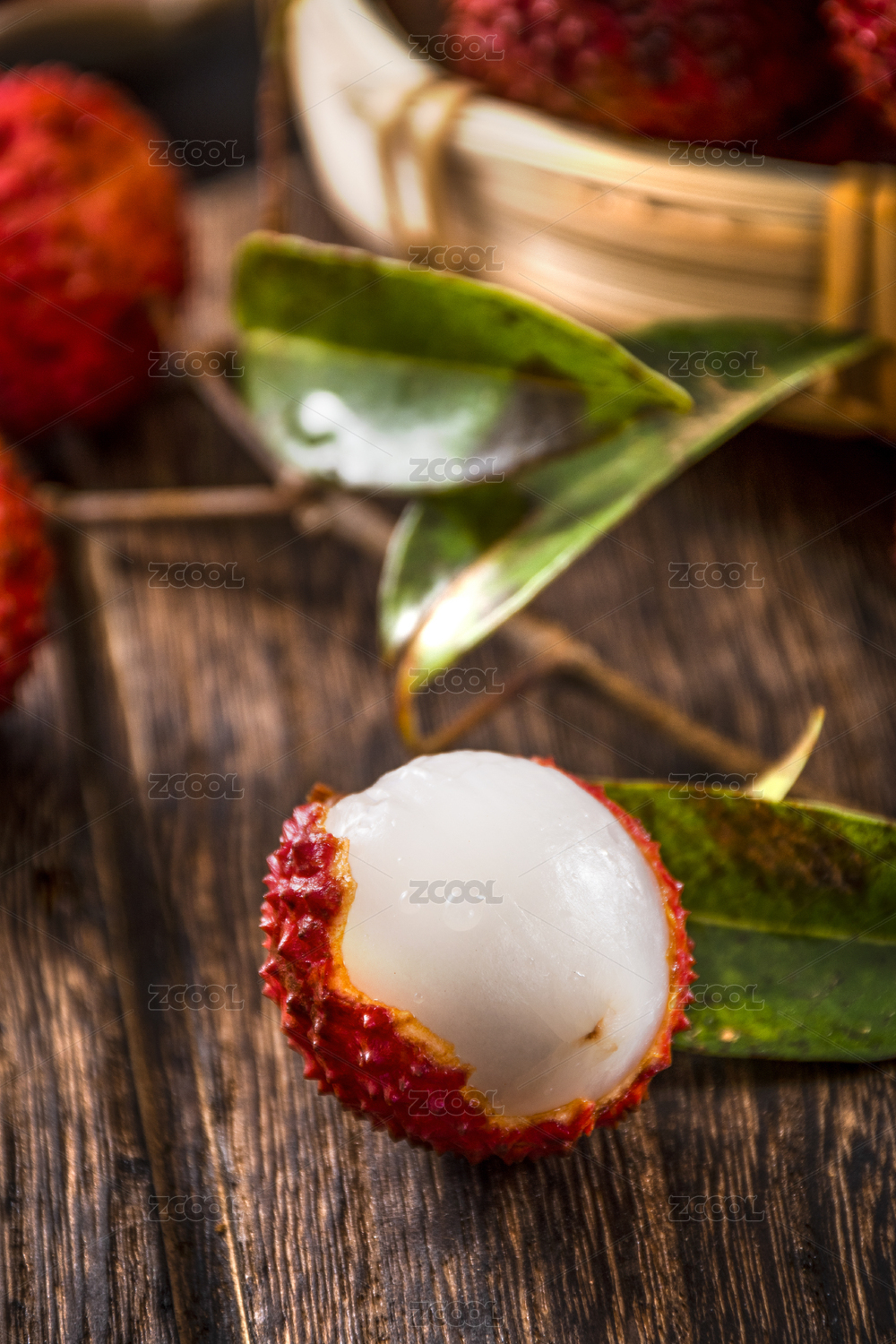 特写竹编的篮子里装满了带叶子的新鲜完整的和剥开一半的荔枝