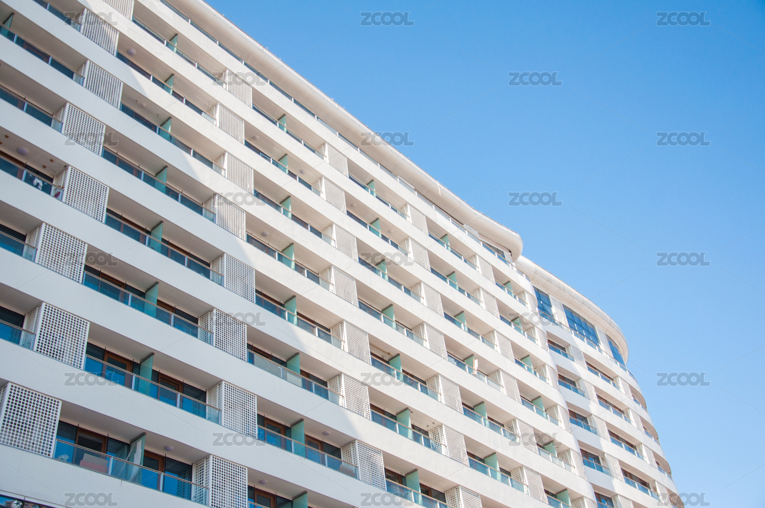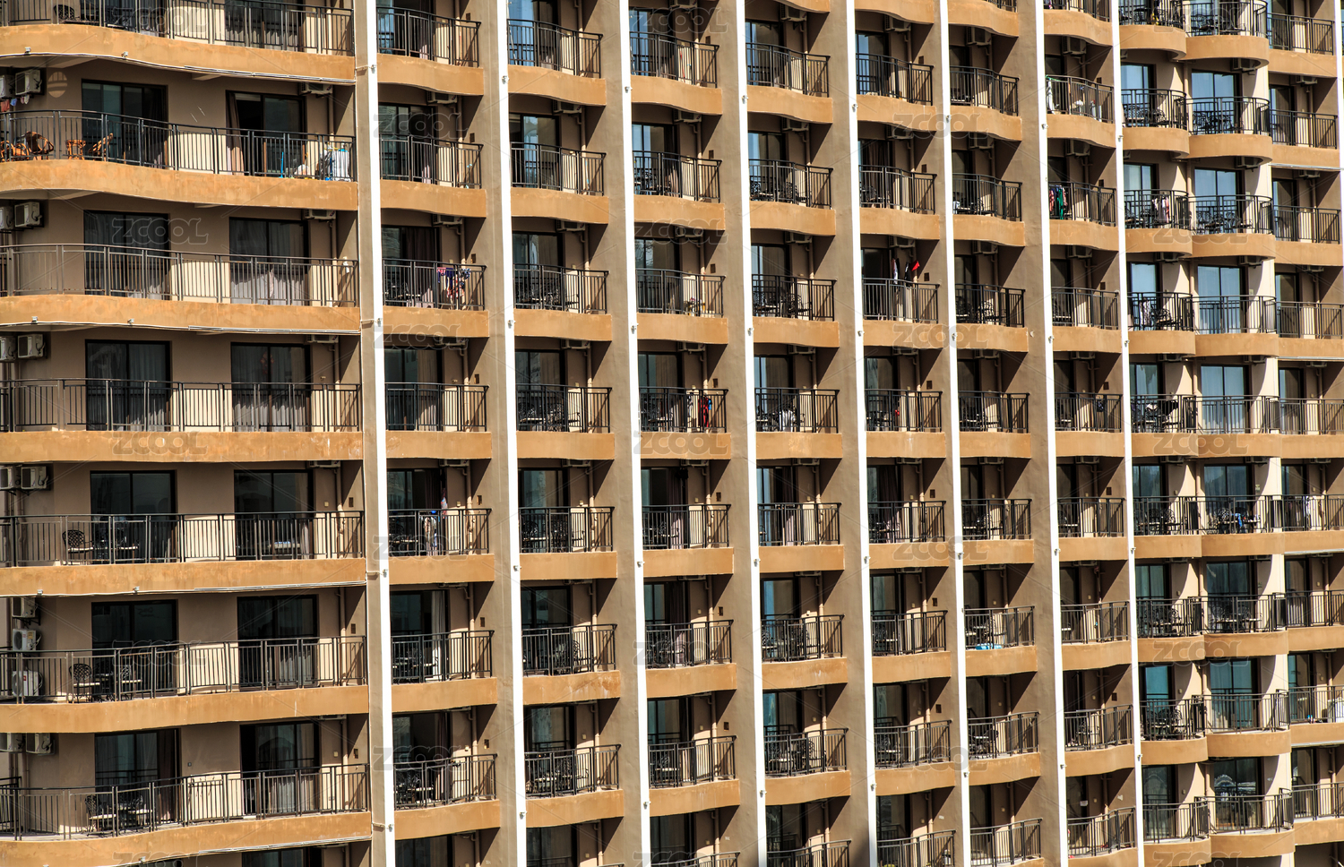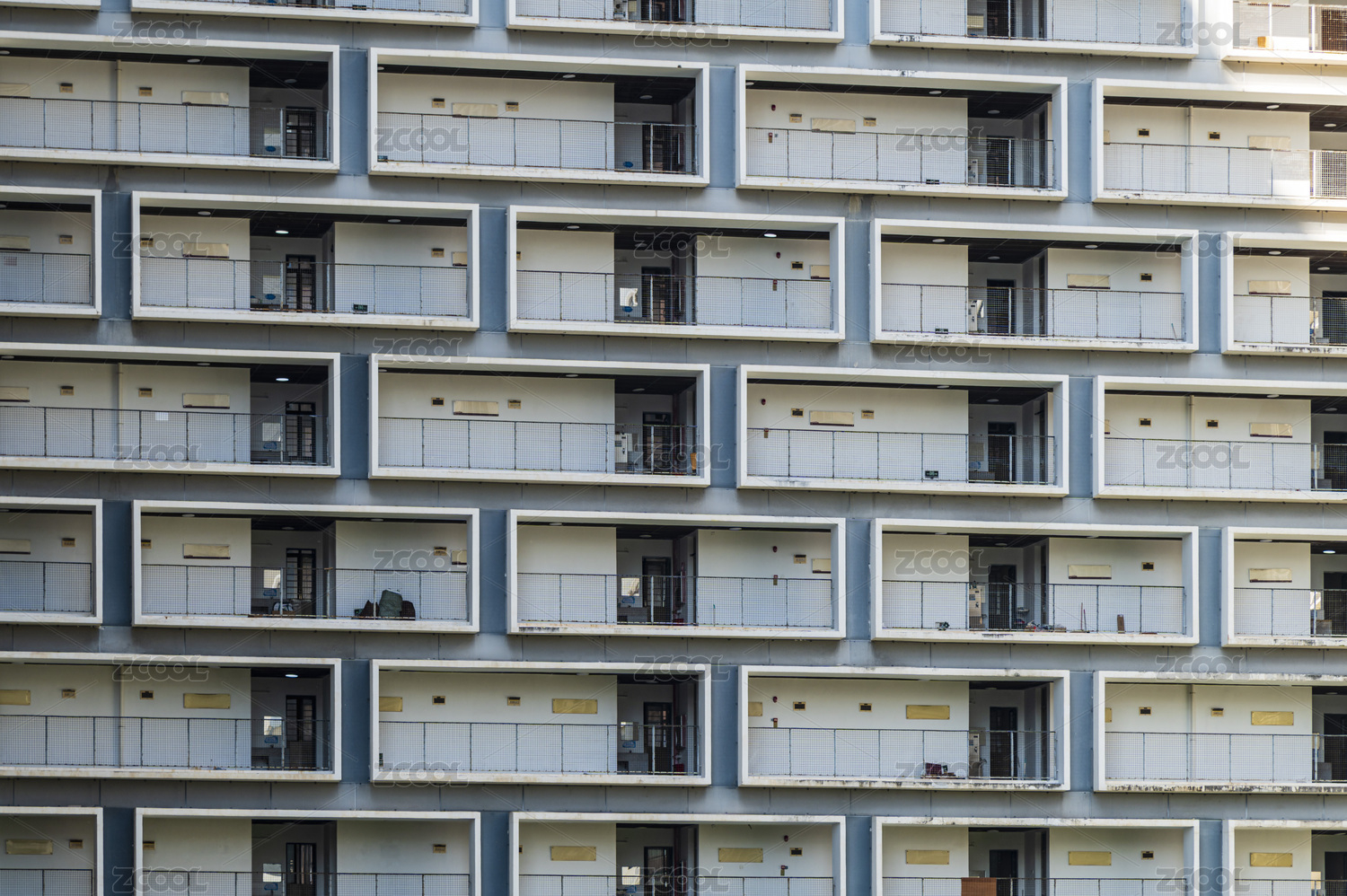 城市住宅建筑物上规则整齐的阳台窗户特写