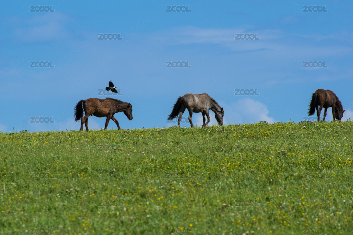 三匹蒙古马及一只飞翔的乌鸦在辉腾锡勒草原