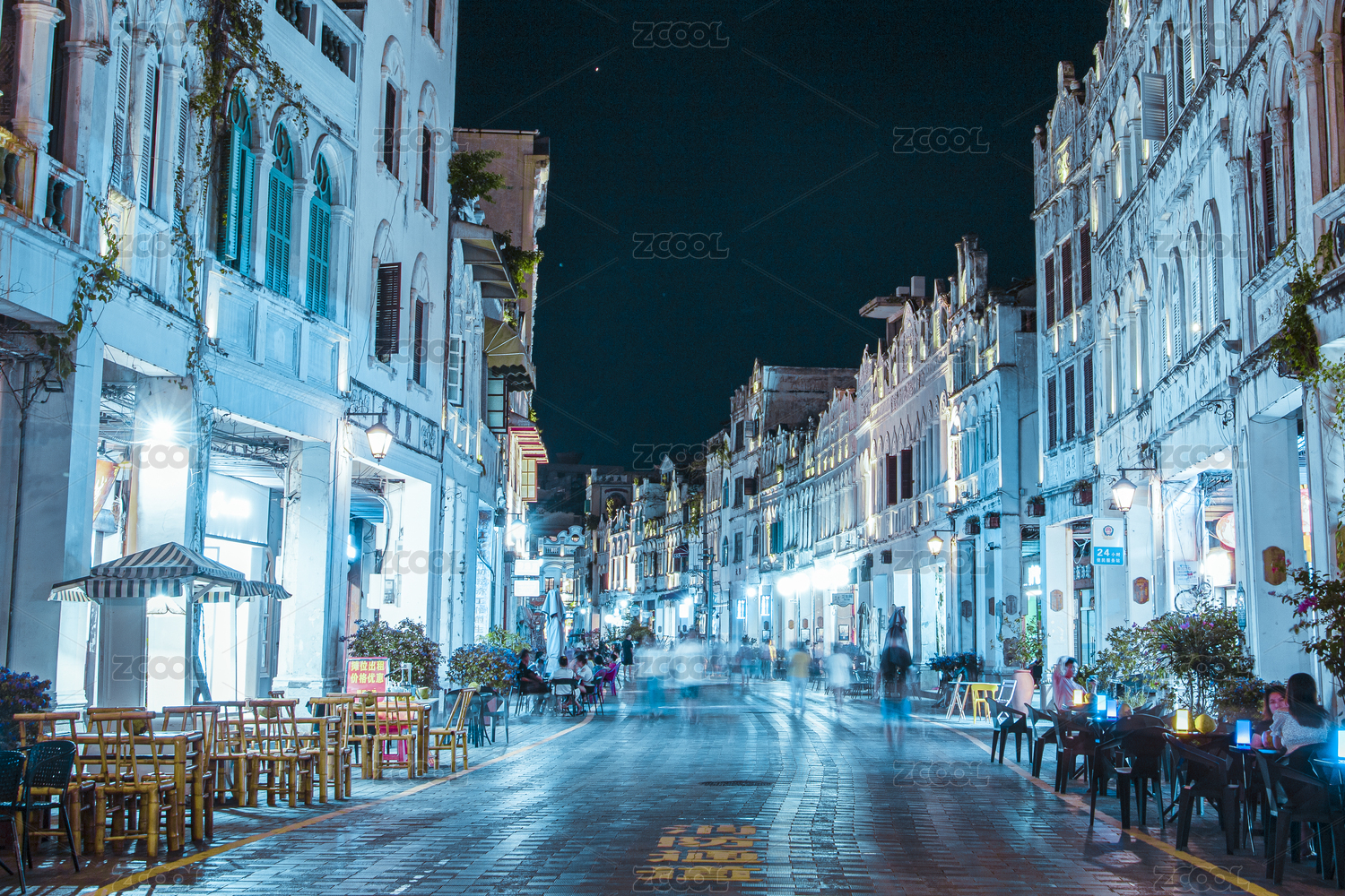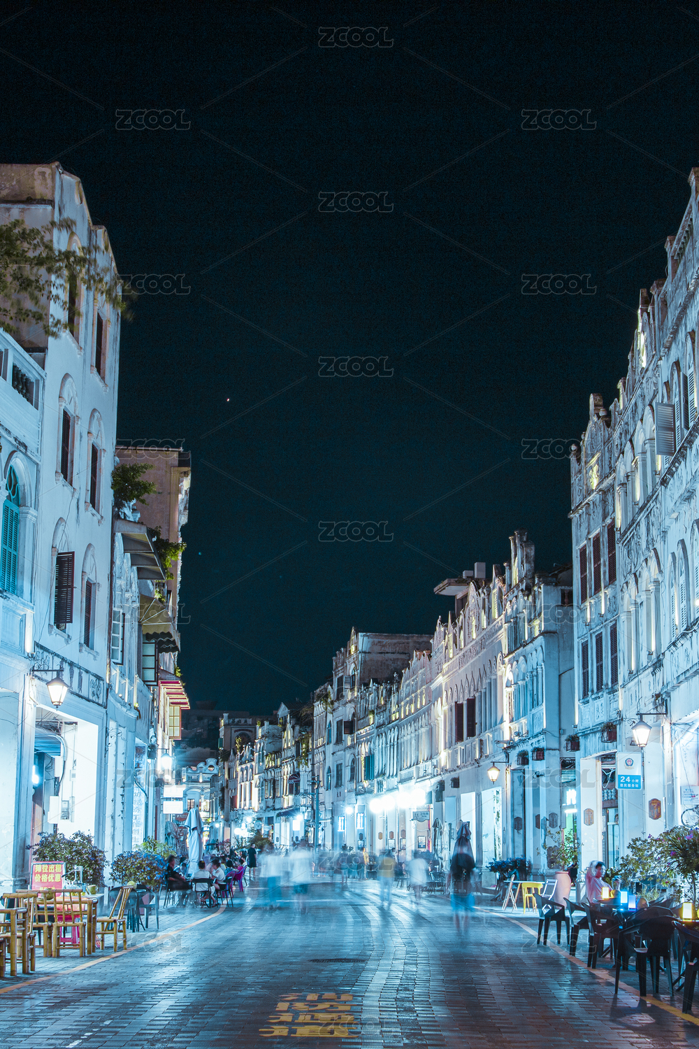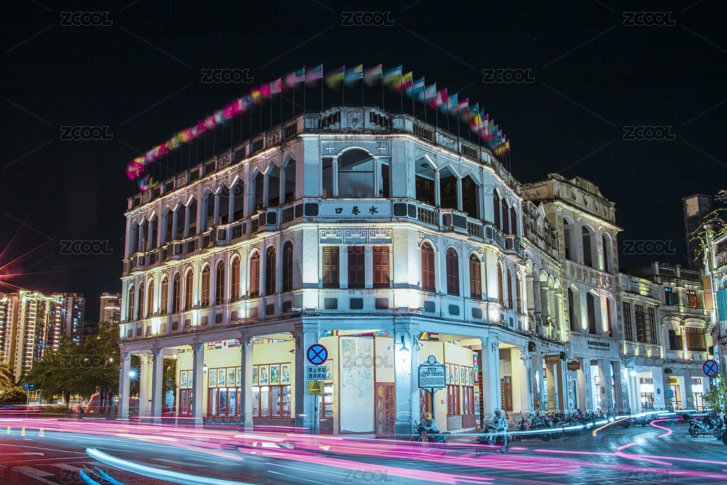 海南省海口市夜晚的骑楼老街灯光摇曳车流