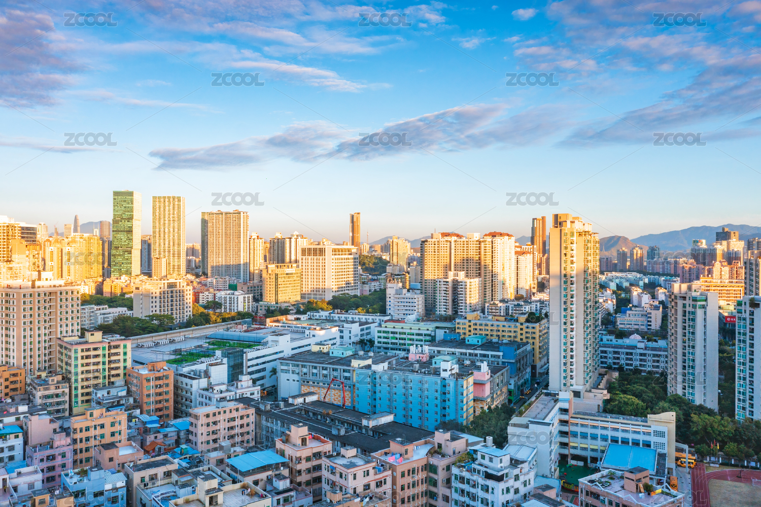 黄昏夕阳下鸟瞰海南省三亚市三亚湾城市风光